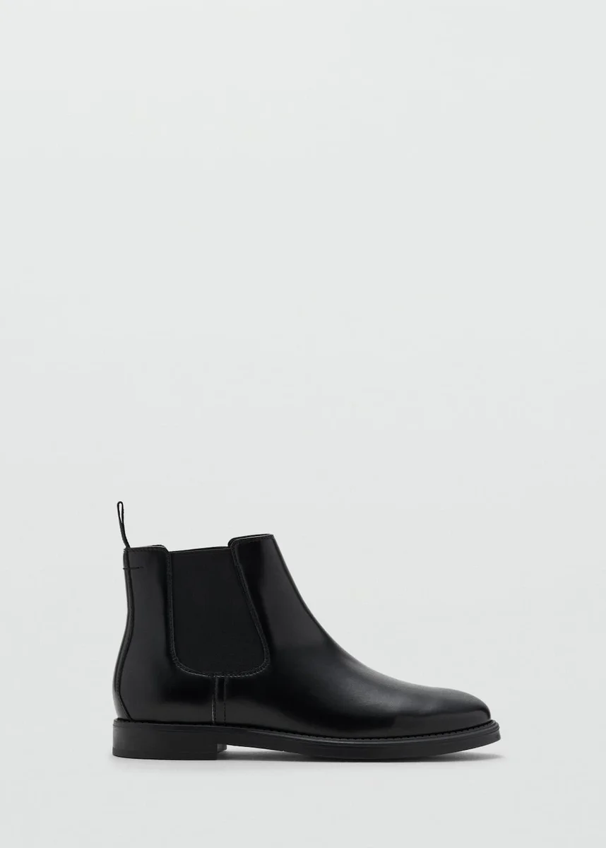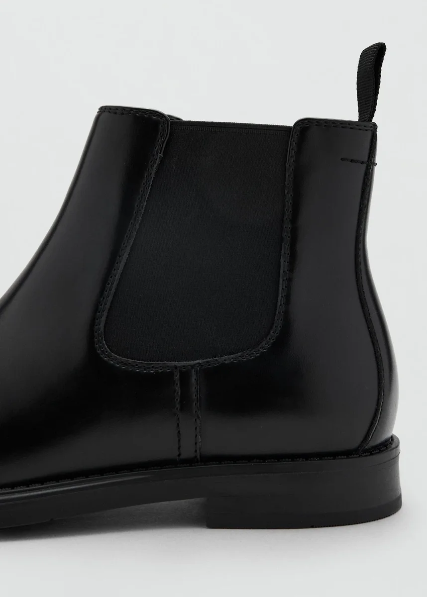 Kožený efekt. Lesklý povrch. Design Chelsea. Kontrastní elastické panely. Zaoblená špička. Zadní poutko