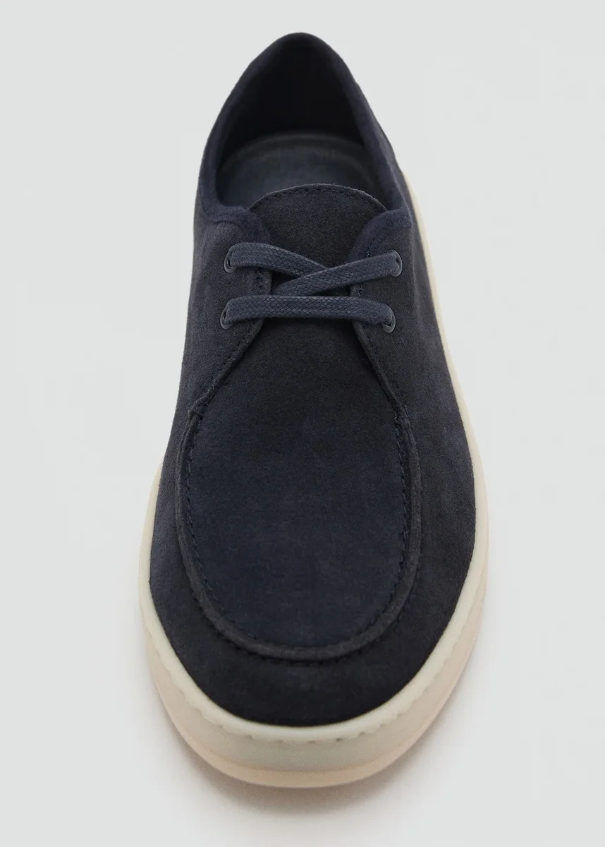 100 % hovězí kůže. Semišový povrch. Šněrování se dvěma polohami. Detaily se zadním prošíváním. Zaoblená špička. Kontrastní gumová podrážka