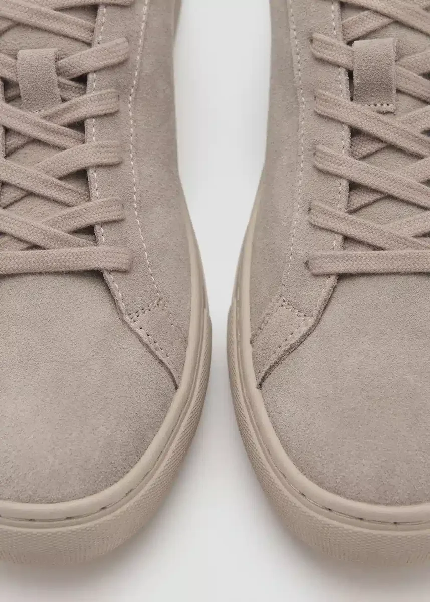 Hovězí kůže. Semišová umělá kůže. Gumová podrážka. Kulatá špička. Šněrování se šesti otvory. Prošívané detaily.