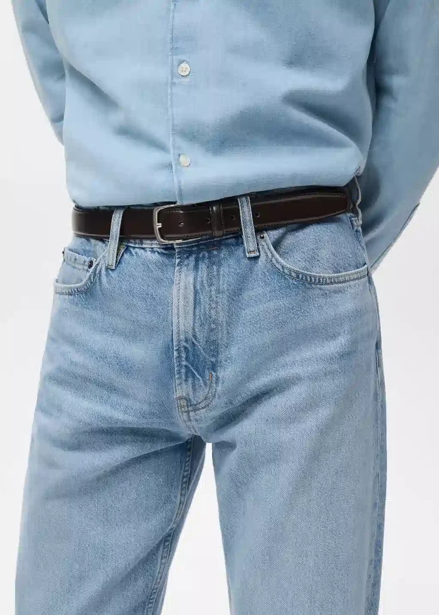 Rovný střih. Středně vysoký pas. 100% bavlna v denimovém stylu. Zapínání na zip a knoflík vpředu. Dvě přední kapsy. Kapsa na mince. Dvě našité kapsy vzadu. Poutka na opasek.