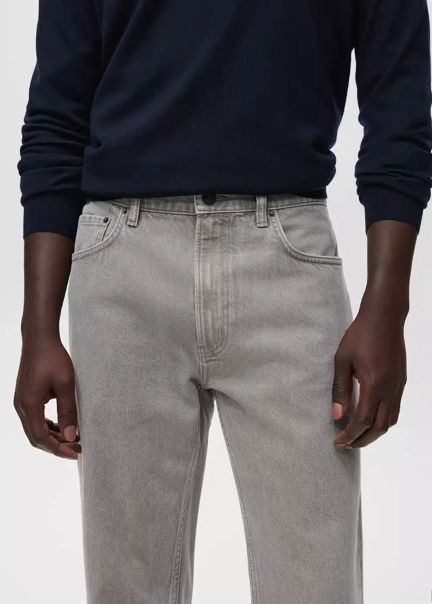 100 % bavlna. Rovný střih. Světle šedá barva. Poutka na opasek. Dvě přední kapsy. Kapsa na mince ve výšce boků. Dvě našité kapsy vzadu. Zapínání na zip a knoflík vpředu