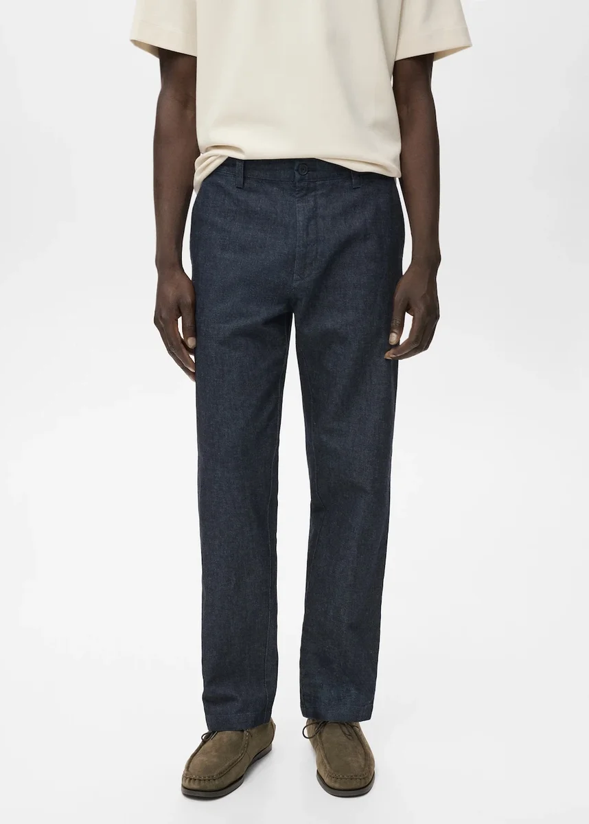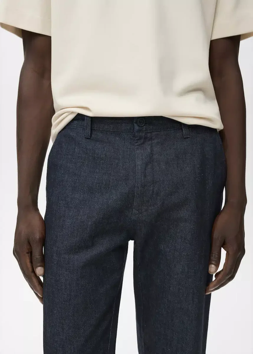 Sada k dispozici jako kompletní look. Směs bavlny a lnu. Rovný střih. Tmavá barva. Poutka na opasek. Zapínání na zip a knoflík. Dvě přední kapsy. Dvě kapsy s klopami na zadní straně.
