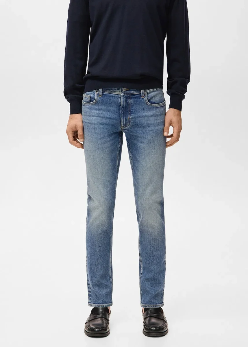 Standardní délka. Slim střih. Normální výška pasu. Slim fit. Bavlněná tkanina. Džínový styl. Zapínání na knoflík a zip. Boční kapsy. Kapsa na mince. Dvě našité kapsy vzadu. Vybledlá tmavá barva. Bavlněná džínovina. Poutka na opasek. Pět kapes. Dvě přední kapsy s lemováním.