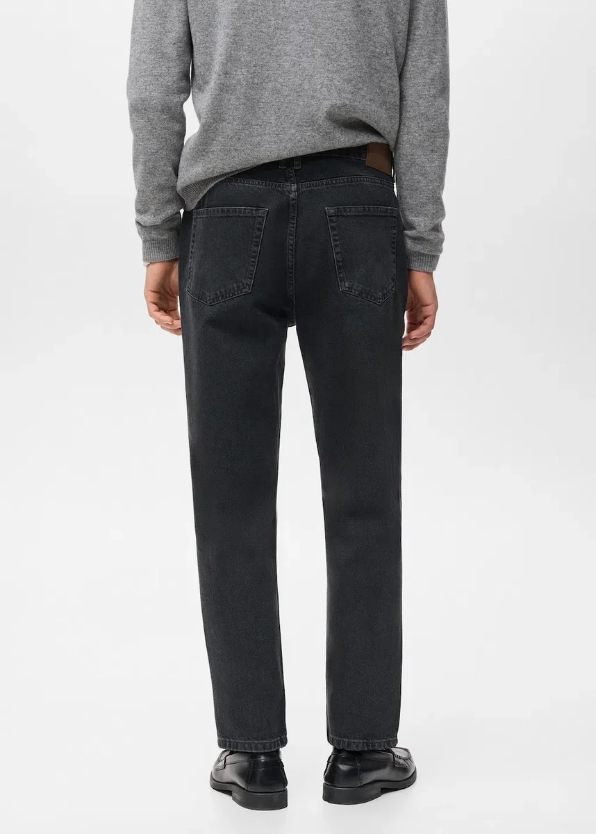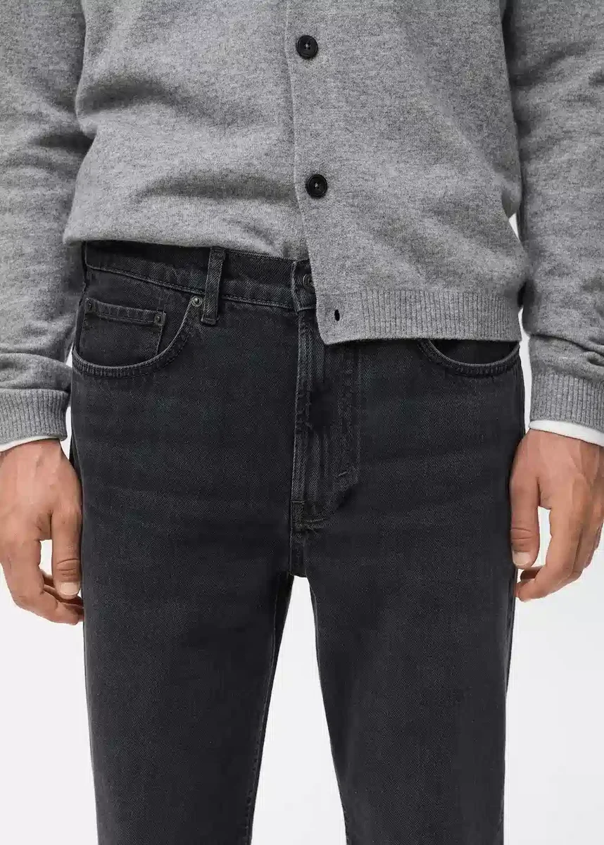100 % bavlna. Tmavá džínovina. Zúžený střih. Normální výška pasu. Dvě boční kapsy. Kapsa na mince ve výšce boků. Poutka na opasek. Zapínání na zip a knoflík.