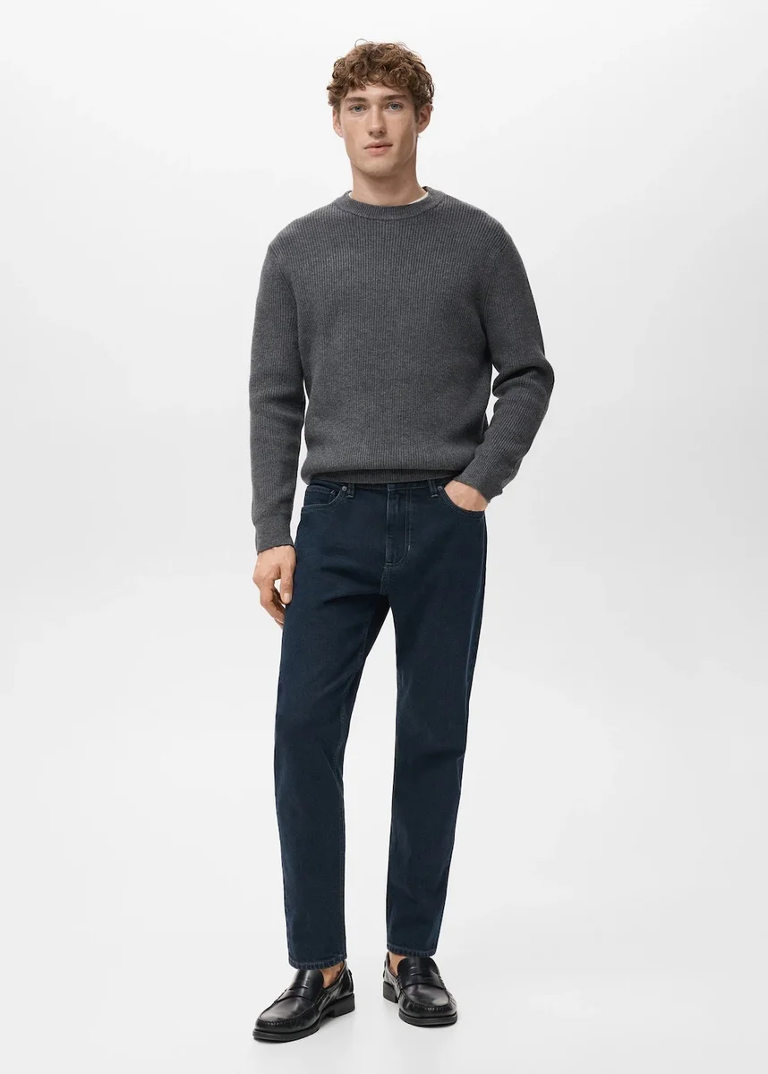 Zúžený střih: široký střih v horní části, který se zužuje od kolen k kotníkům. Bavlněná tkanina. Styl džínových kalhot. Krátký střih. Tmavé praní. Poutka na opasek. Zapínání na zip a knoflík. Dvě boční kapsy. Kapsa na mince. Dvě našité kapsy vzadu.