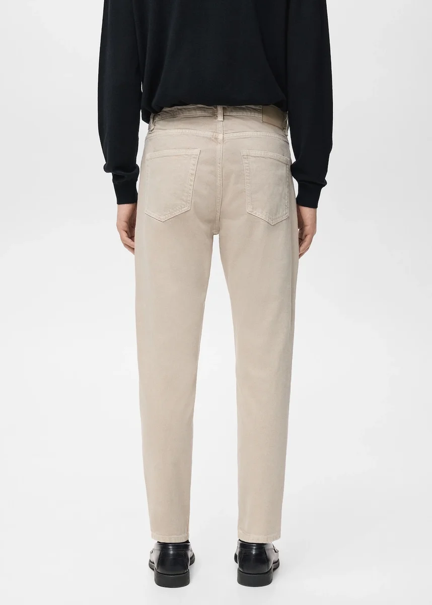 Zúžený střih: široký střih v horní části, který se zužuje od kolen k kotníkům. Krátký střih. Bavlněná džínovina. Poutka na pásek. Zapínání na knoflík a zip. Kapsa na mince ve výšce boků. Dvě boční kapsy. Dvě našité kapsy vzadu.