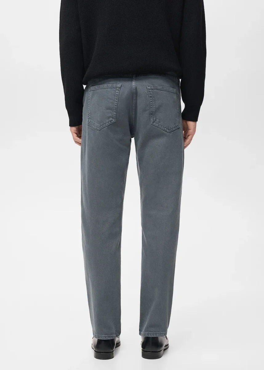 Zúžený střih: široký střih v horní části, který se zužuje od kolen k kotníkům. Krátký střih. Bavlněná džínovina. Poutka na pásek. Zapínání na knoflík a zip. Kapsa na mince ve výšce boků. Dvě boční kapsy. Dvě našité kapsy vzadu.