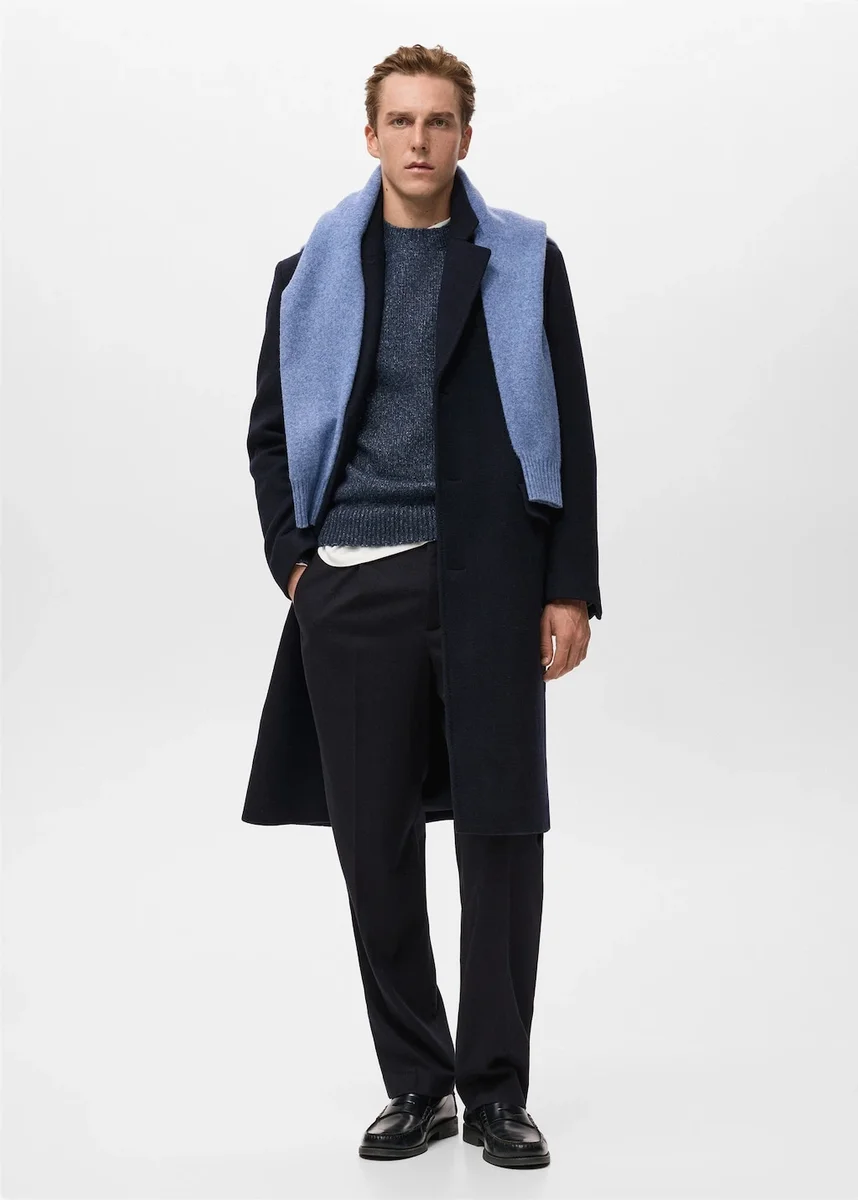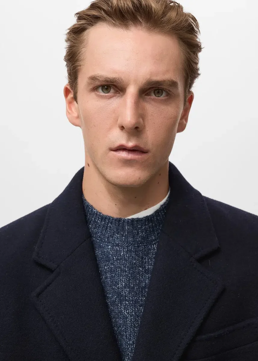 Směsová vlna. Dlouhý střih. Límec s klopami. Zapínání na tři knoflíky. Manžety na knoflíky. Dvě kapsy s klopami na přední straně. Rozparek uprostřed zadního dílu. Vnitřní podšívka