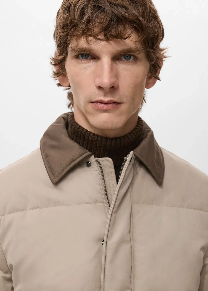 Regular fit. Vodoodpudivý: Technická vodoodpudivá tkanina. Prošívaný design. Kontrastní výstřih do V. Dvě boční kapsy s jedním zapínáním na druk. Vnitřní kapsa s lemem. Dlouhé rukávy s manžetami na knoflíky. Zapínání na zip a druky vpředu.