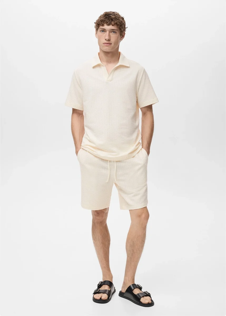Bavlněná směsová tkanina. Rovný střih. Seersuckerový efekt. Elastický pas se stahovací šňůrkou. Boční kapsy. Jedna našitá kapsa na zadní straně. Sada k dispozici jako kompletní look