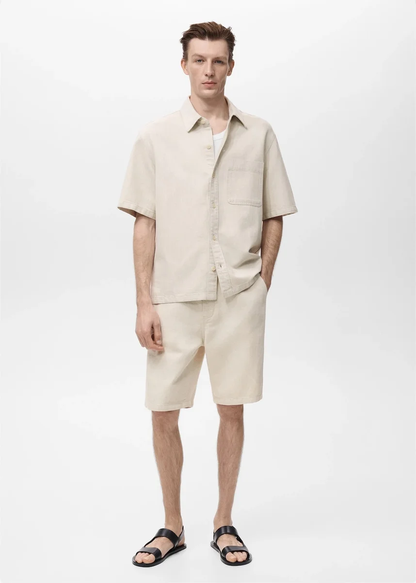 Rovný střih. Bavlna a len. Poutka na opasek. Nastavitelná stahovací šňůrka. Zapínání na knoflík a zip. Boční kapsy. Nášivkové kapsy na zadní straně.