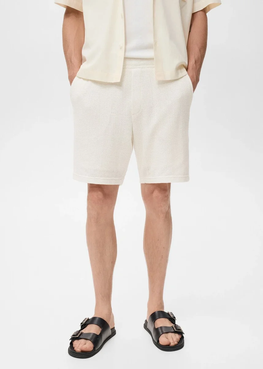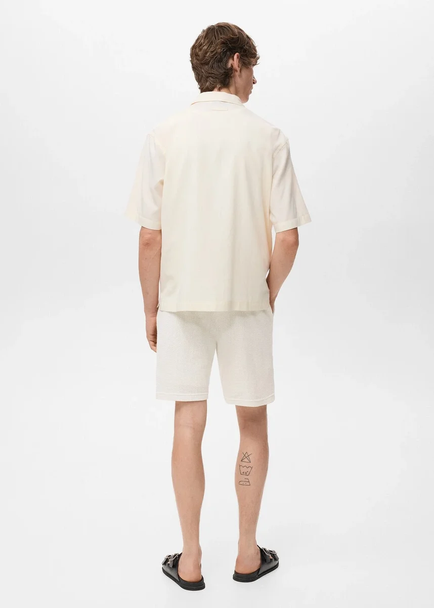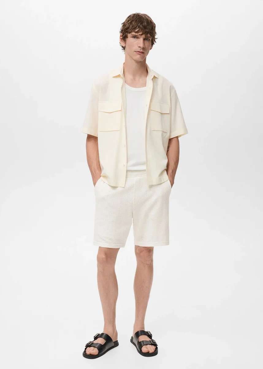 Texturovaná bavlněná tkanina. Pas s nastavitelnou vnitřní stahovací šňůrkou. Dvě přední kapsy. Ozdobná kapsa na zadní straně