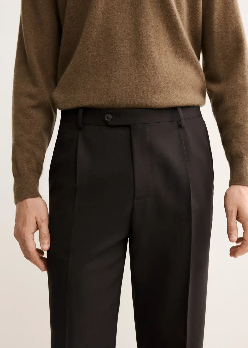 100% vlněná tkanina. Regular fit. Na přední straně záševky. Žehlené pruhy na přední a zadní straně. Zapínání na knoflík, háček a zip. Knoflíky na vnitřní straně pasu pro ramenní popruhy. Poutka na opasek. Dvě boční kapsy s lemováním. Dvě kapsy s lemováním a knoflíkem na zadní straně.