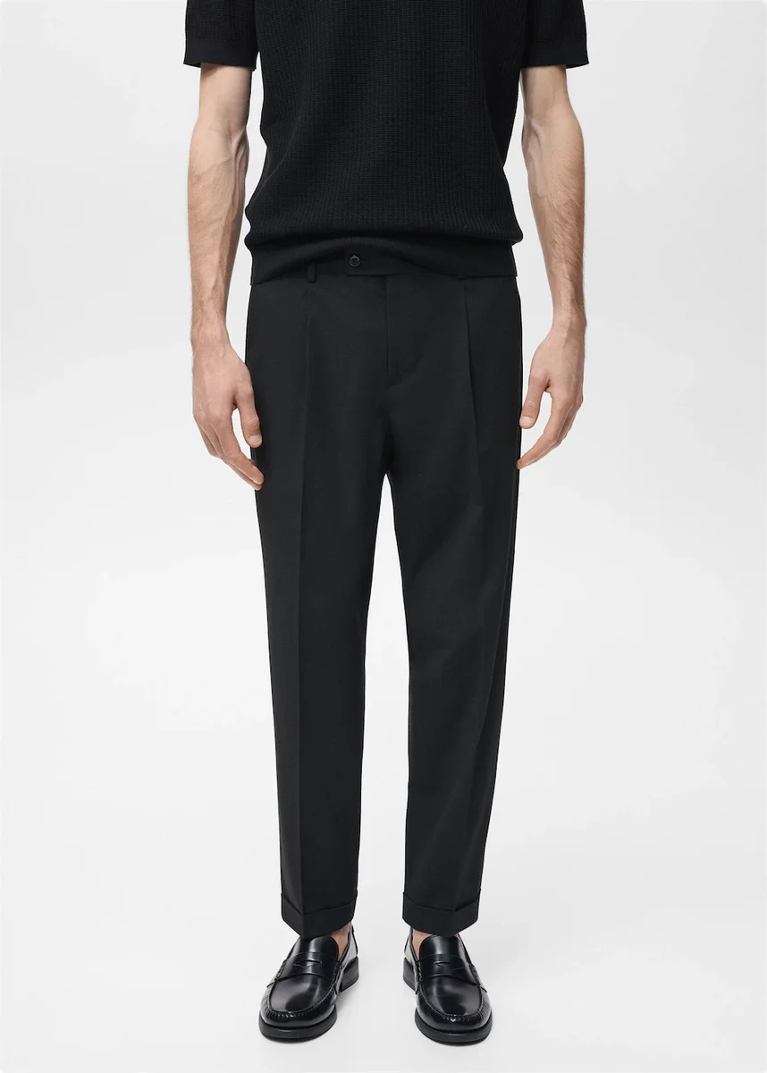 Kolekce Tailoring. Regular fit. Zkrácený střih. Na přední straně záševky. Zapínání na knoflík, háček a zip. Poutka na opasek. Dvě boční kapsy. Kapsa na mince. Dvě zadní kapsy s knoflíkem. Lem s manžetou