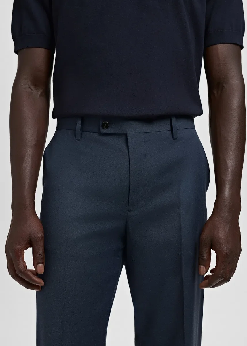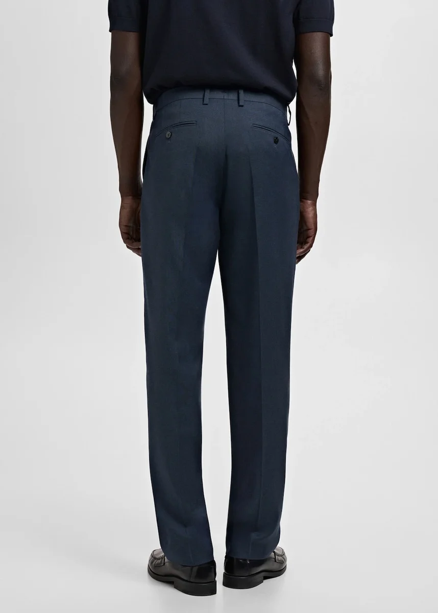 Regular fit. Detail předních a zadních kalhotek. Přední zapínání na dvojřadé knoflíky a zip. Poutka na opasek. Dvě boční kapsy. Kapsa na mince. Dvě zadní kapsy s knoflíkem.