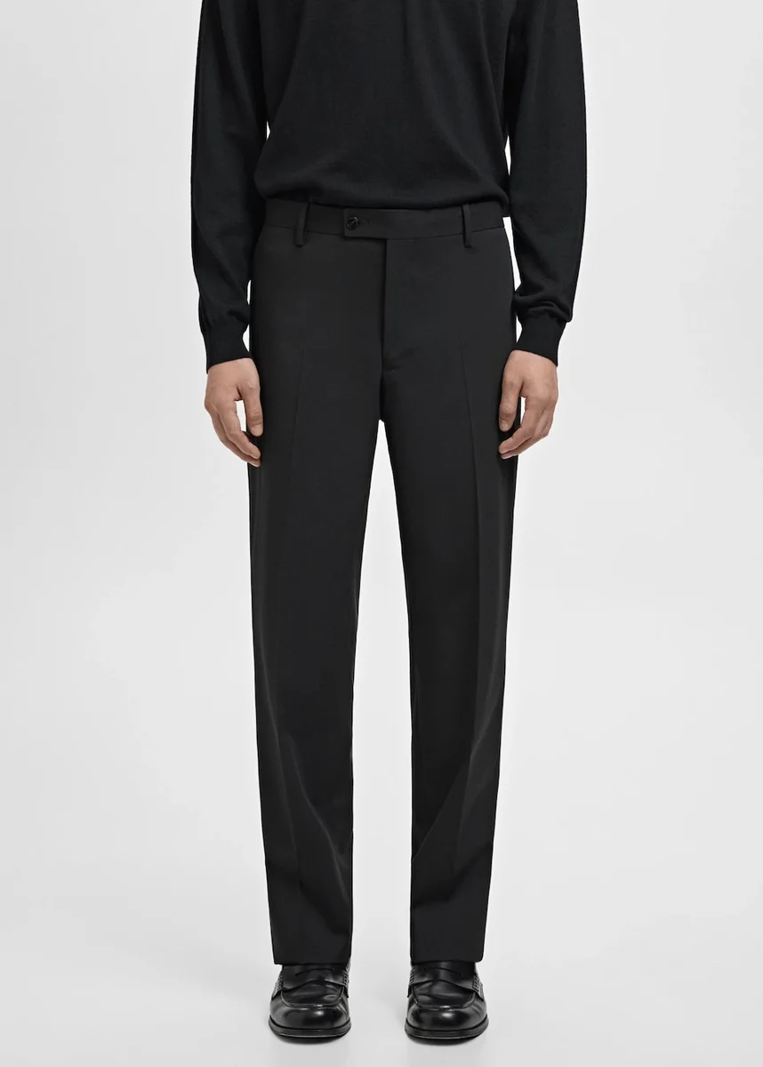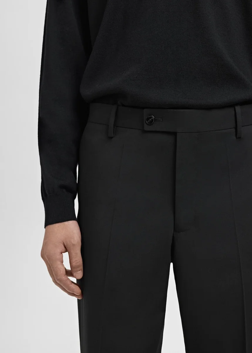 Regular fit. Žehlené pruhy. Přední zapínání na knoflíky a zip. Poutka na opasek. Dvě boční kapsy. Kapsa na mince. Dvě kapsy s knoflíkem vzadu.