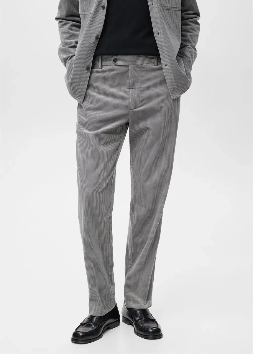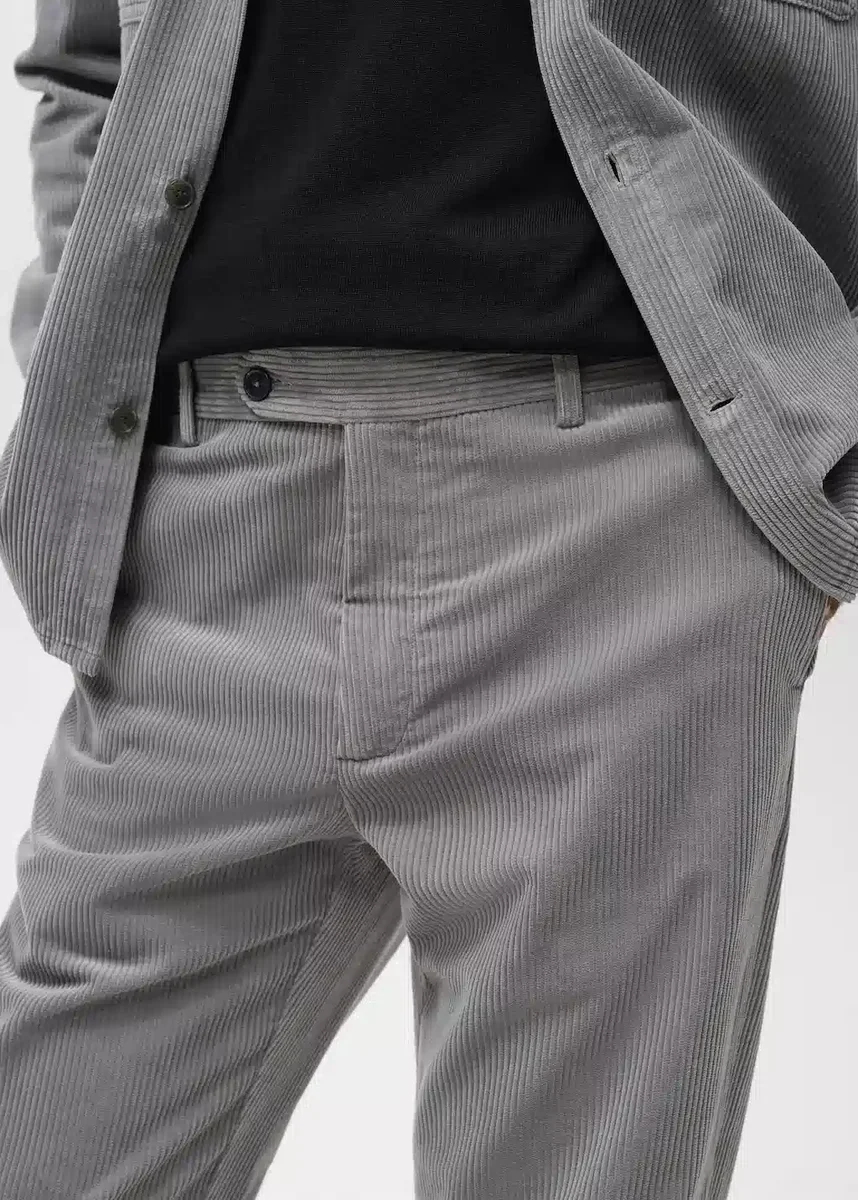 Střední výška pasu. Regular fit. Manšestrová tkanina. Žehlené pruhy vpředu a vzadu. Zapínání vpředu na dvouřadé knoflíky a zip. Kapsa na mince ve výšce boků. Poutka na opasek. Dvě boční kapsy. Dvě kapsy s knoflíkem vzadu.