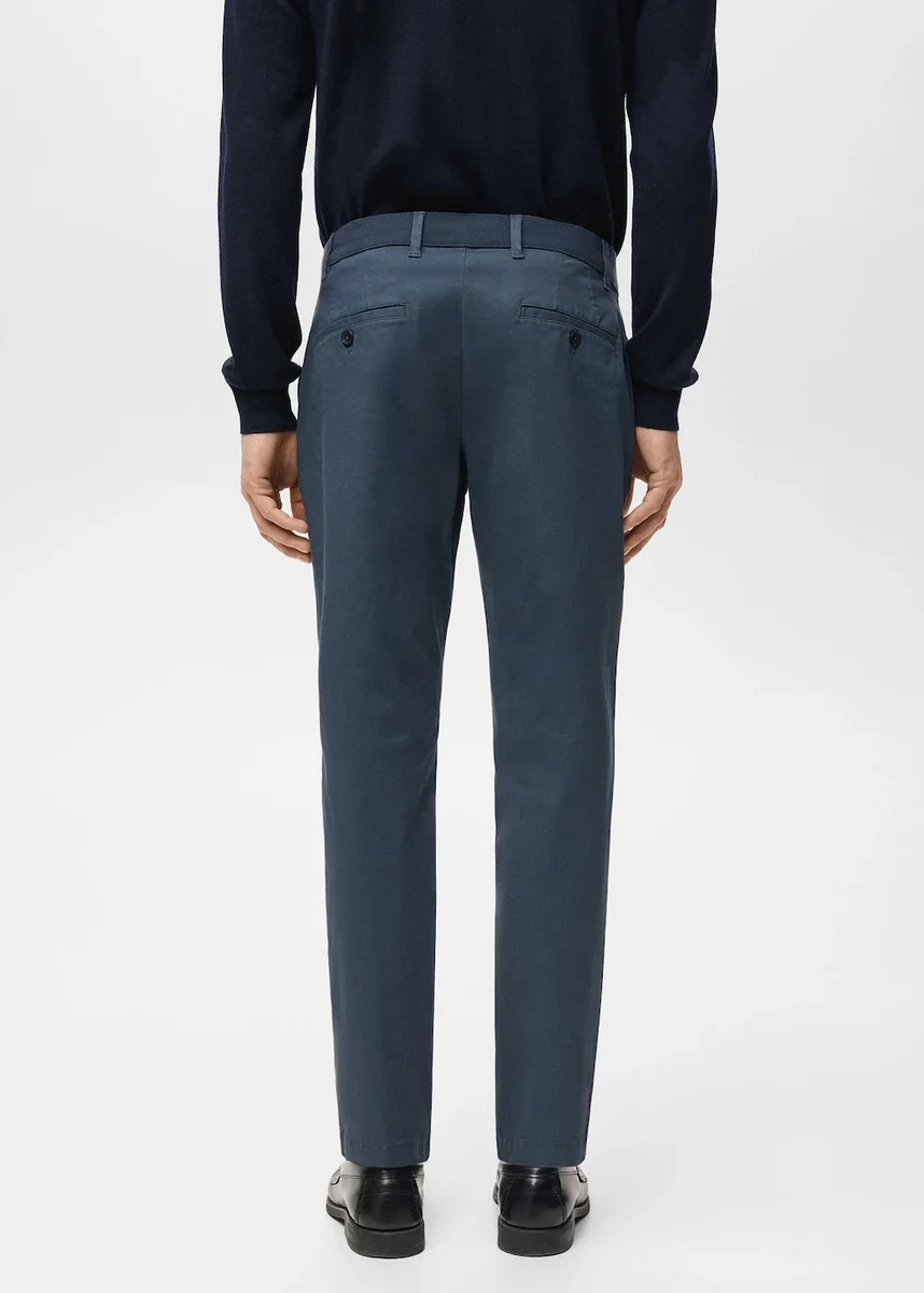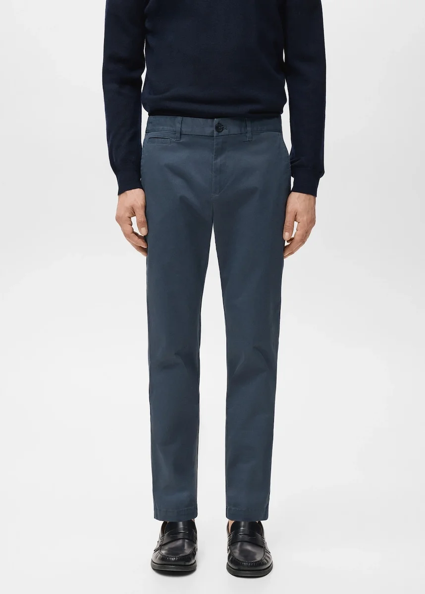 Styl chino. Zúžený střih: široký střih v horní části, který se zužuje od kolen k kotníkům. Bavlněná tkanina. Poutka na opasek. Pas s nastavitelnou vnitřní stahovací šňůrkou. Zapínání na zip a knoflík. Měkká guma v přední části pasu pro větší pohodlí a podporu rostoucího bříška. Kapsa na mince ve výšce boků. Dvě přední kapsy. Dvě kapsy s klopami na knoflíky na zadní straně. Štíhlý střih. Normální výška pasu. Standardní délka.