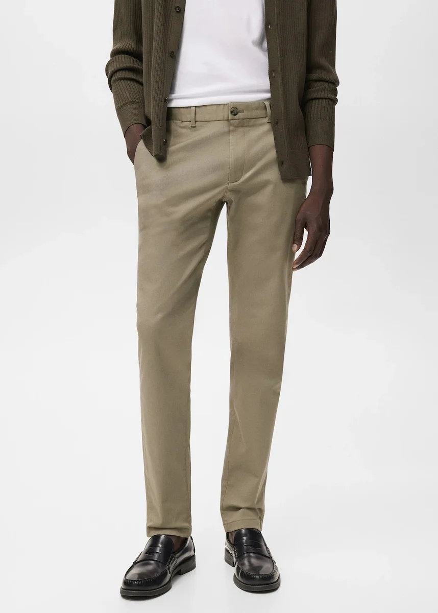 Slim fit. Styl chino. Bavlněný elastan. Poutka na opasek. Dvě boční kapsy. Kapsa na mince. Dvě zadní kapsy s lemováním. Zapínání na zip a knoflík.
