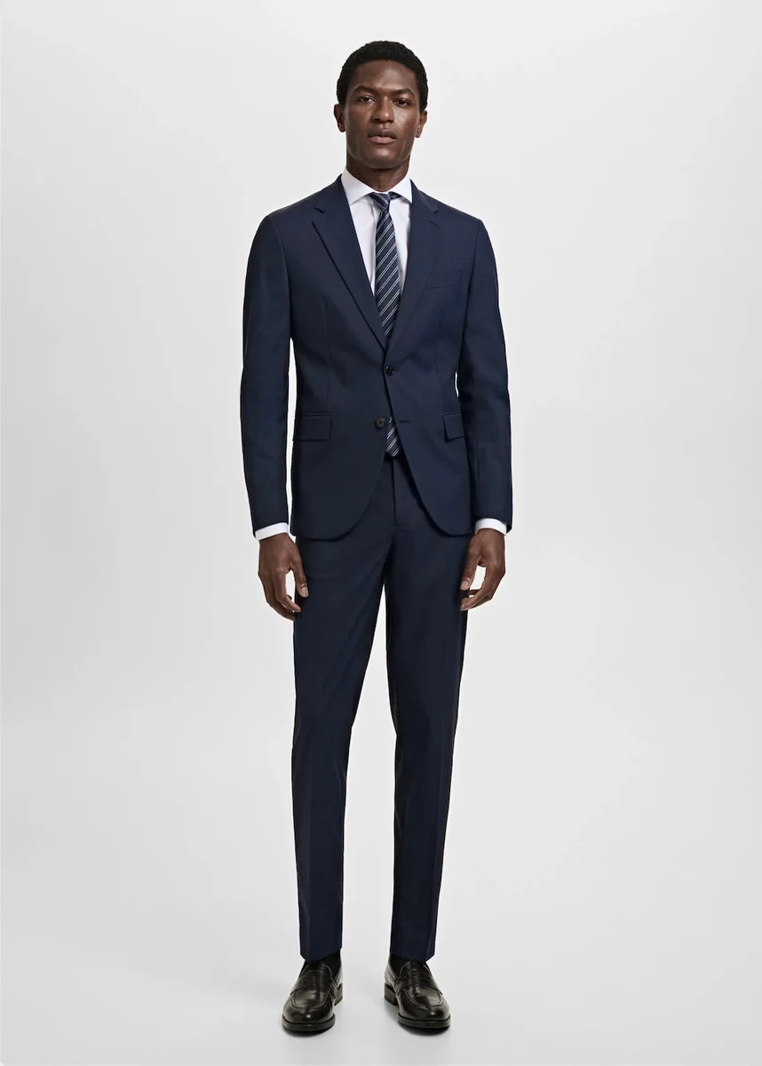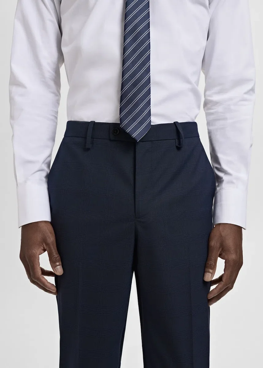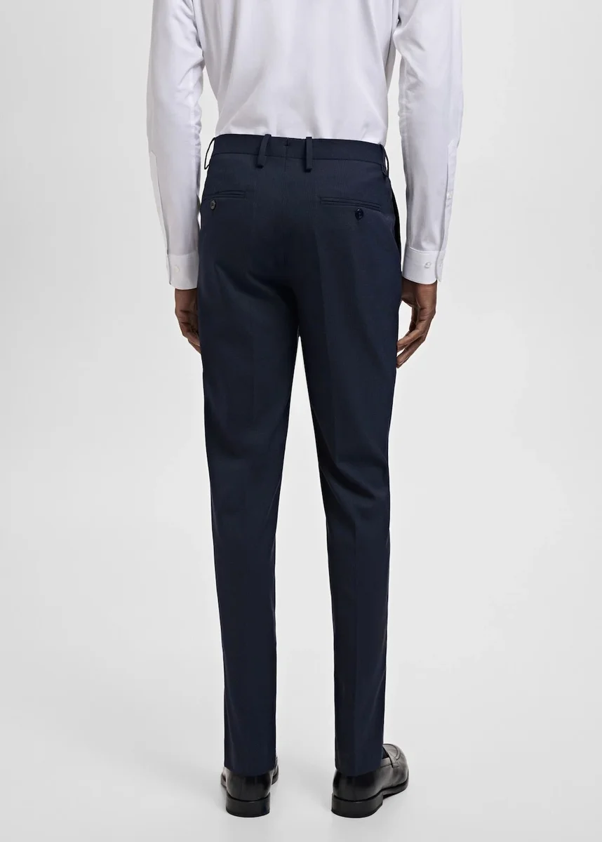 Úzký střih. Žehlené pruhy vpředu a vzadu. Poutka na opasek. Dvě boční kapsy. Dvě kapsy vzadu.