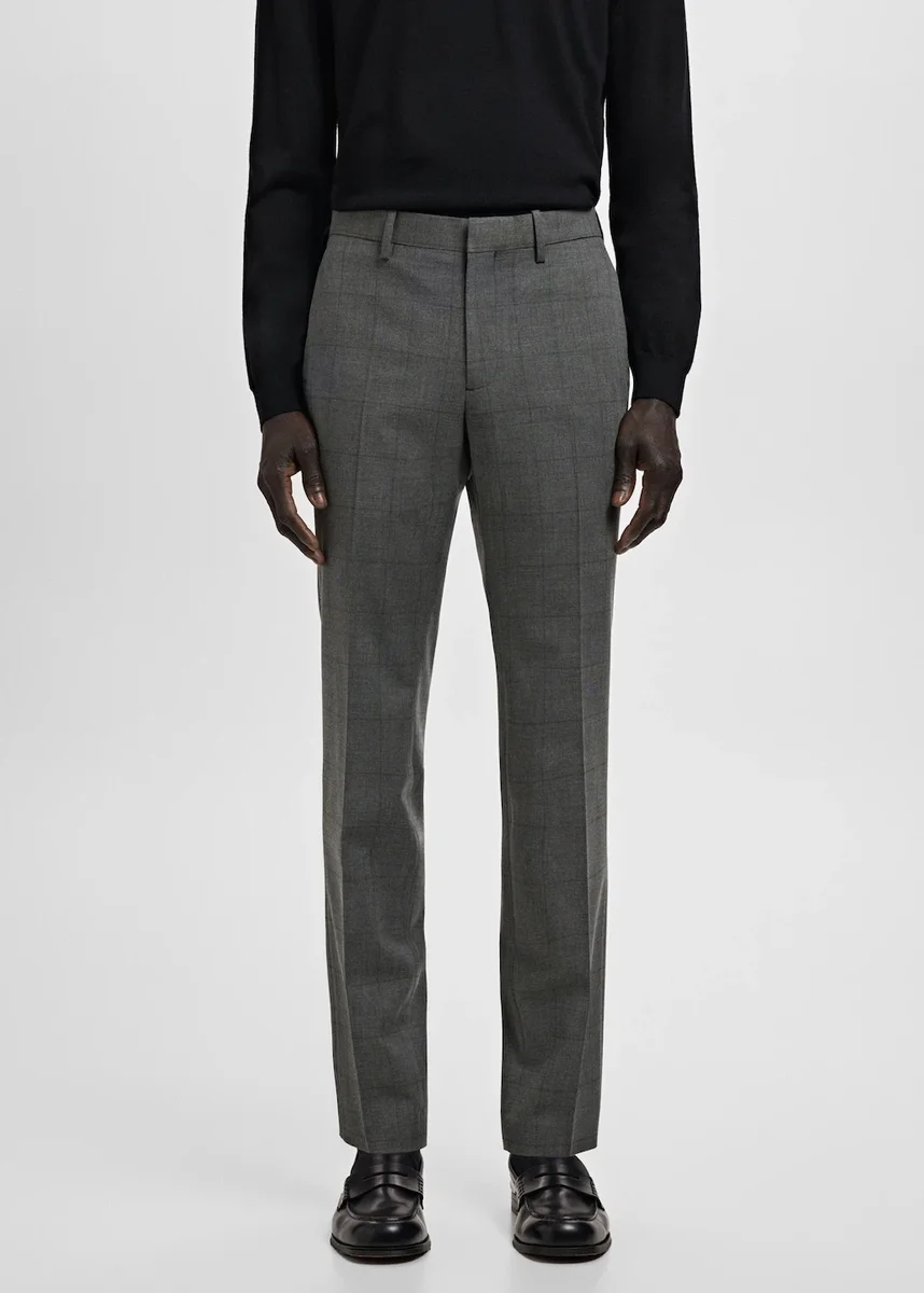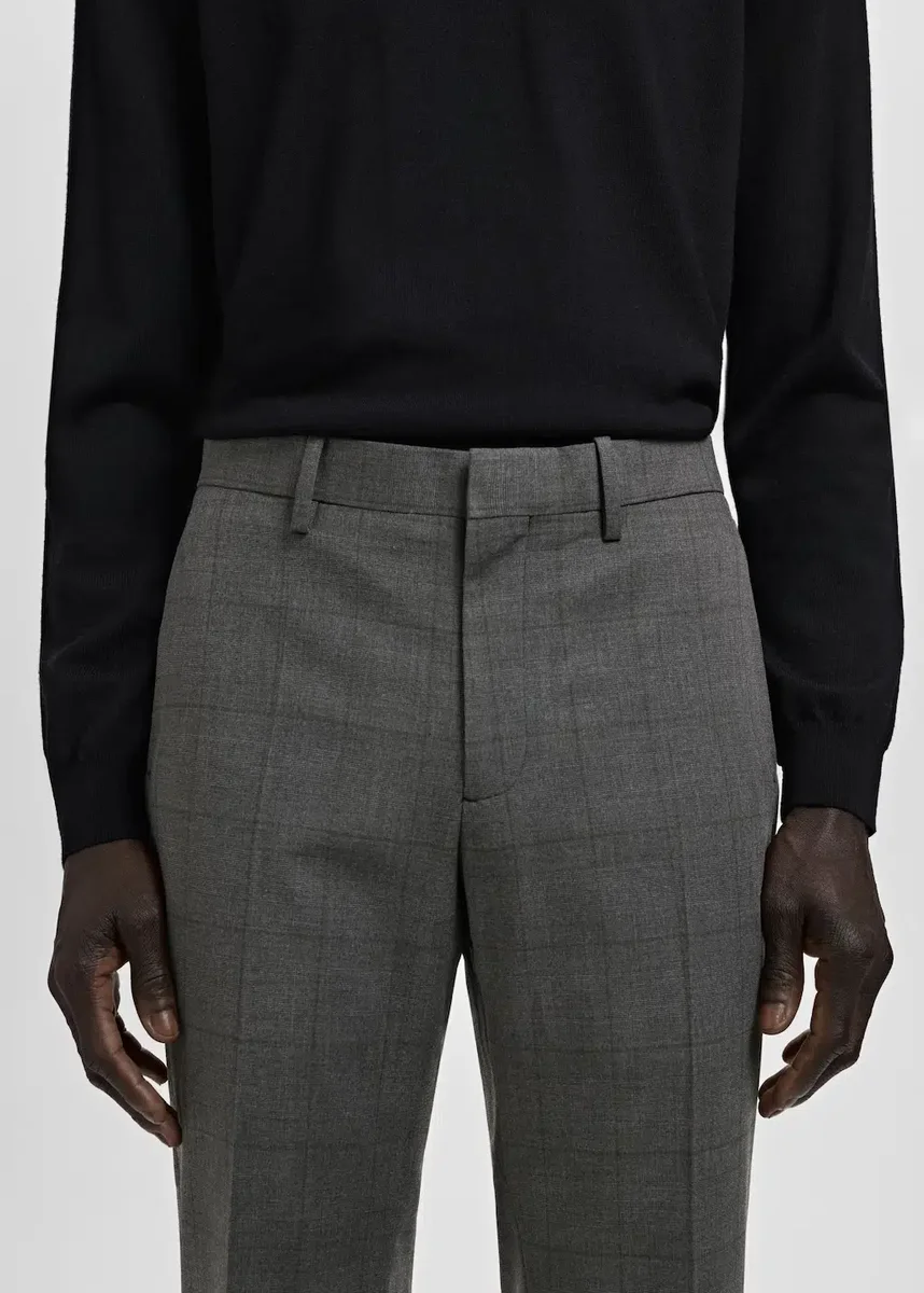 Super slim fit. Boční kapsy. Žehlené pruhy vpředu a vzadu. Dvě kapsy s knoflíkem vzadu. Poutka na opasek. Zapínání vpředu na dvouřadé knoflíky a zip.