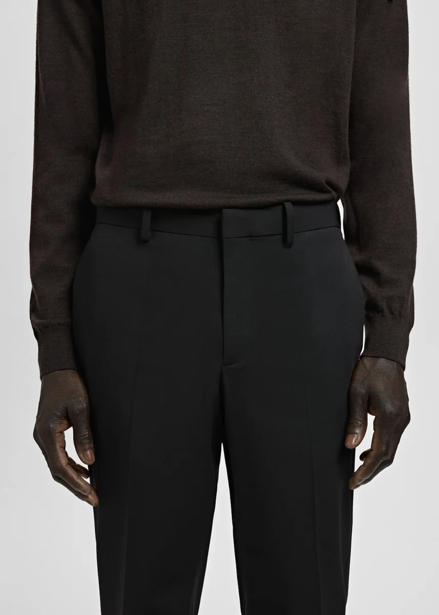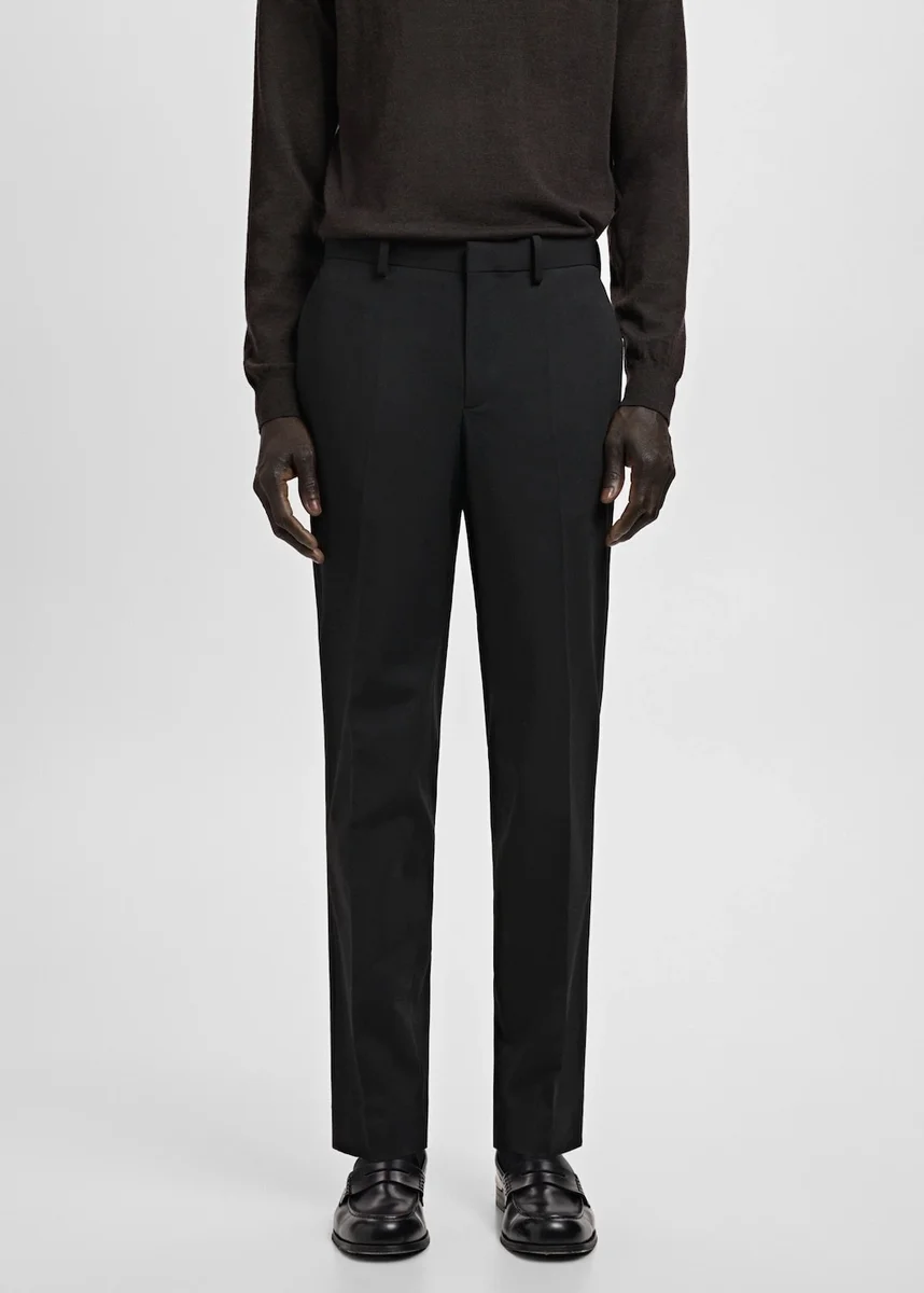 Super slim fit. Směs bavlny a viskózy. Žehlené pruhy vpředu a vzadu. Dvě boční kapsy. Dvě kapsy s knoflíkem vzadu. Zapínání vpředu na zip a skryté knoflíky. Poutka na opasek.