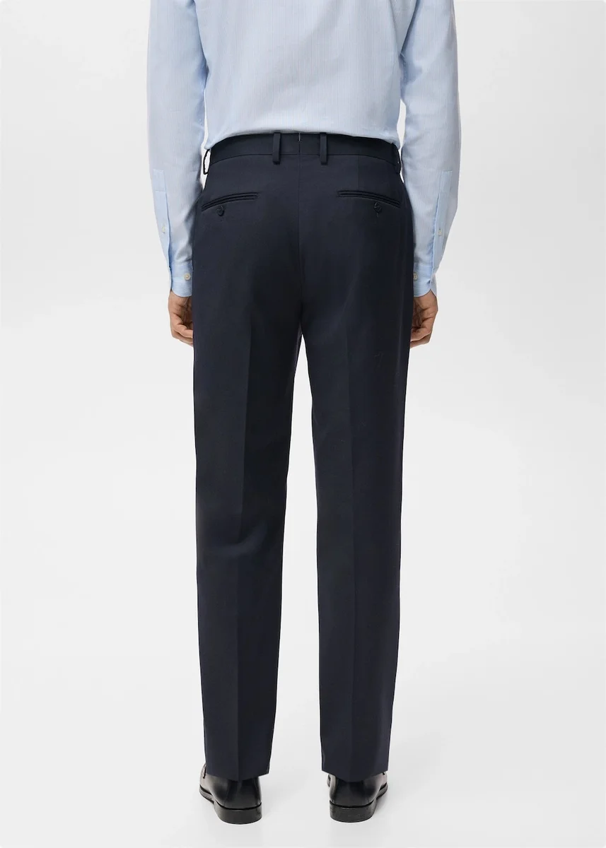 Úzký střih. 100% vlněná tkanina. Žehlené pruhy. Poutka na opasek. Dvě boční kapsy. Dvě kapsy s klopou vzadu. Zapínání na zip, háček a dvojité knoflíky vpředu.