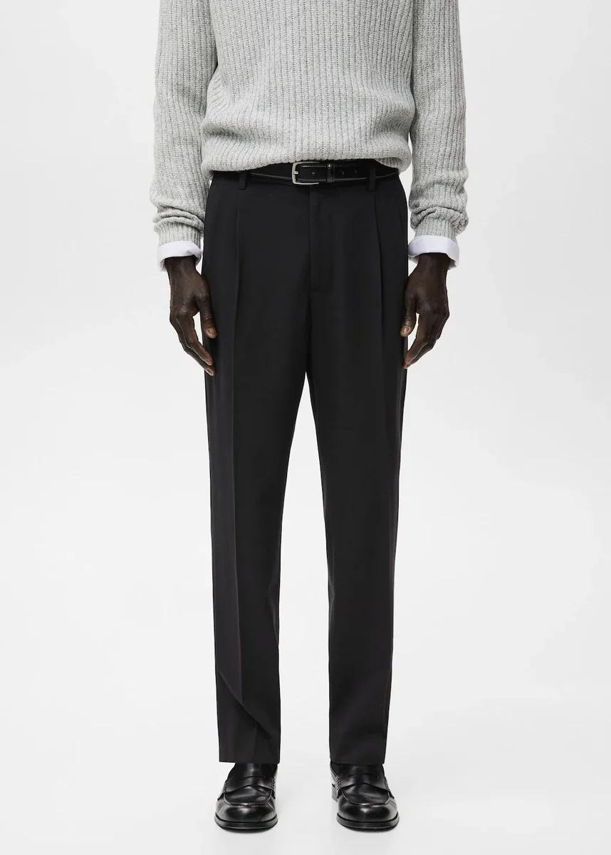Regular fit. Přední záhyb. Žehlené pruhy vpředu a vzadu. Dvě boční kapsy. Dvě kapsy s knoflíkem vzadu. Poutka na opasek. Zapínání na zip a knoflík vpředu.