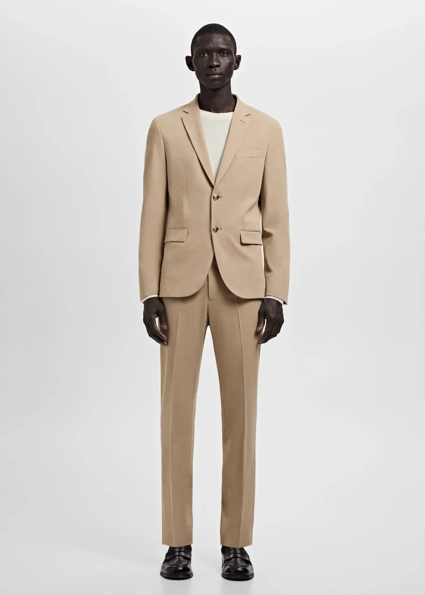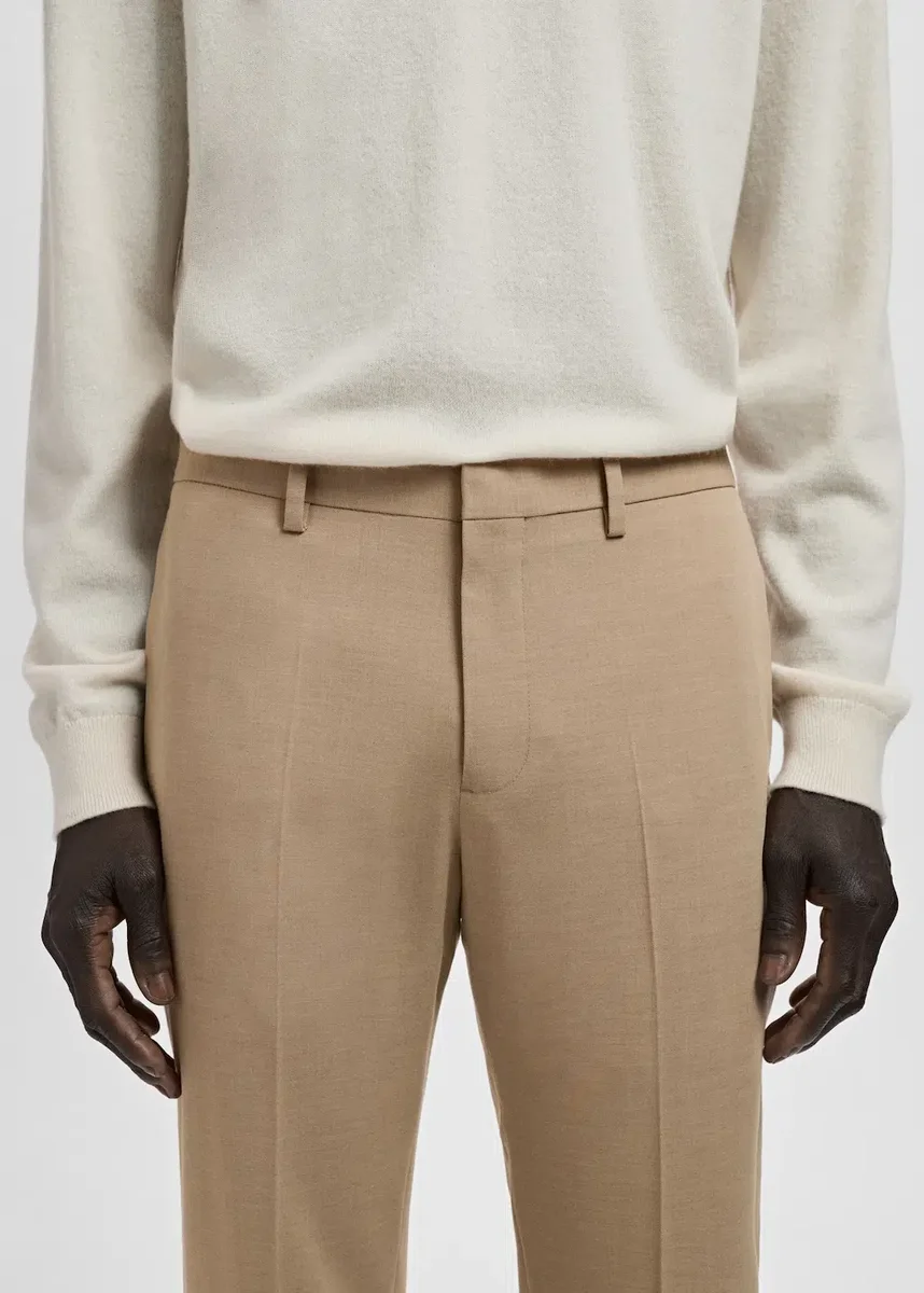 Super slim fit. Žehlené pruhy vpředu a vzadu. Dvě kapsy s knoflíkem vzadu. Boční kapsy. Poutka na opasek. Zapínání vpředu na dvouřadé knoflíky a zip.