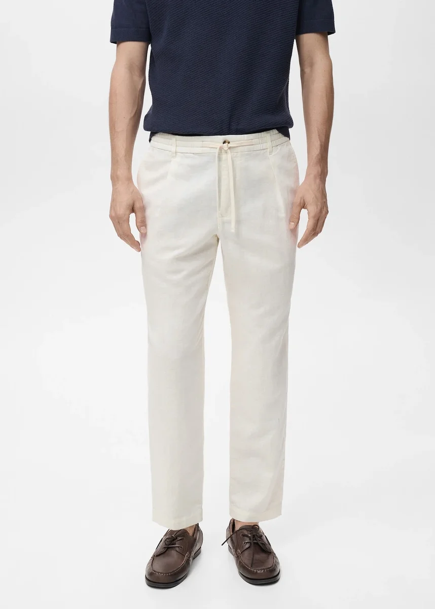 Směs bavlny a lnu. Slim fit střih. Elastický pas s nastavitelnou šňůrkou. Šňůrka s možností viditelného nebo skrytého uzlu na vnitřní straně. Poutka na opasek. Zapínání vpředu na knoflíky a zip. Záševky vpředu. Dvě přední kapsy. Dvě zadní kapsy s knoflíkem. Směs lnu. Slim fit střih.