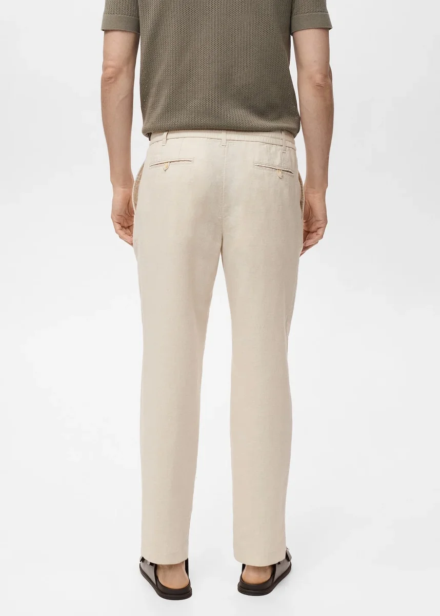 Směs bavlny a lnu. Úzký střih. Elastický pas s nastavitelnou šňůrkou. Šňůrka s možností viditelného nebo skrytého uzlu na vnitřní straně. Poutka na opasek. Zapínání vpředu na knoflíky a zip. Záševky vpředu. Dvě přední kapsy. Dvě kapsy s patkou a knoflíkem vzadu. Směs lnu. Úzký střih. Black Friday.