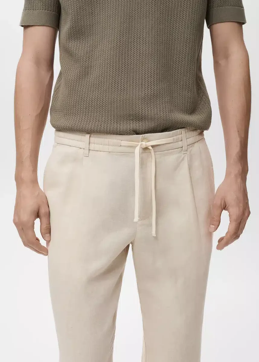Směs bavlny a lnu. Úzký střih. Elastický pas s nastavitelnou šňůrkou. Šňůrka s možností viditelného nebo skrytého uzlu na vnitřní straně. Poutka na opasek. Přední zapínání na dvojřadé knoflíky a zip. Záševky na přední straně. Dvě přední kapsy. Dvě kapsy s knoflíkem na zadní straně. Směs lnu. Úzký střih. Černý pátek