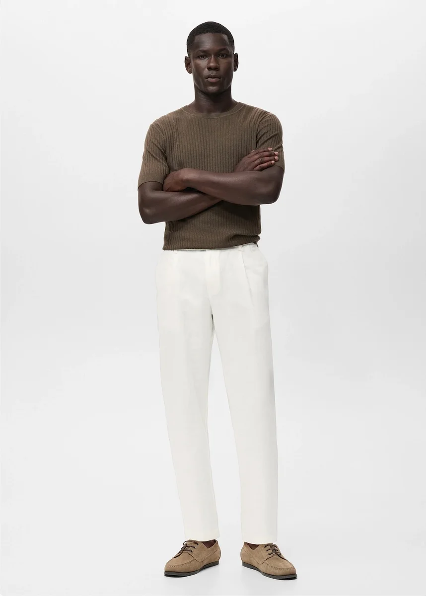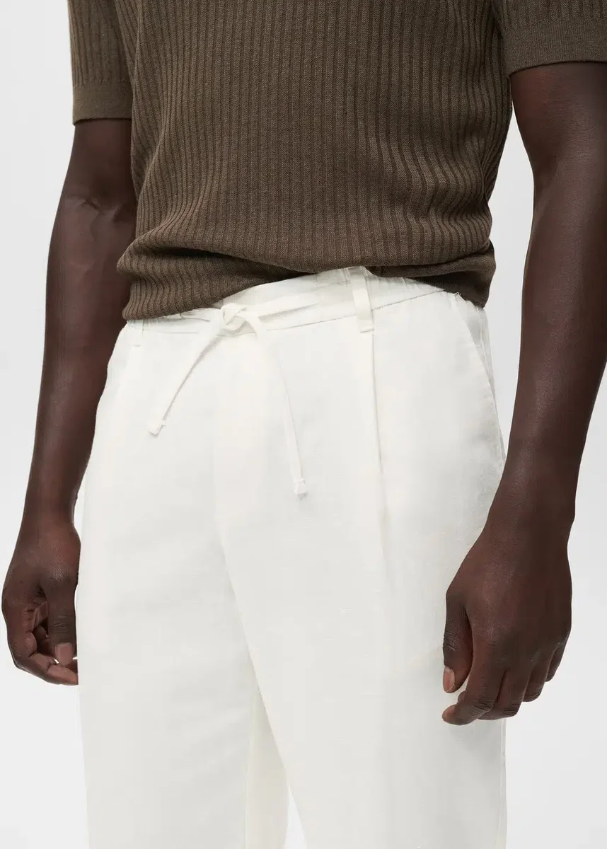 Slim fit. Směs bavlny a lnu. Elastický pas s nastavitelnou stahovací šňůrkou. Přední záhyb. Dvě přední kapsy. Dvě zadní kapsy. Poutka na opasek. Zapínání vpředu na dvojřadé knoflíky a zip.