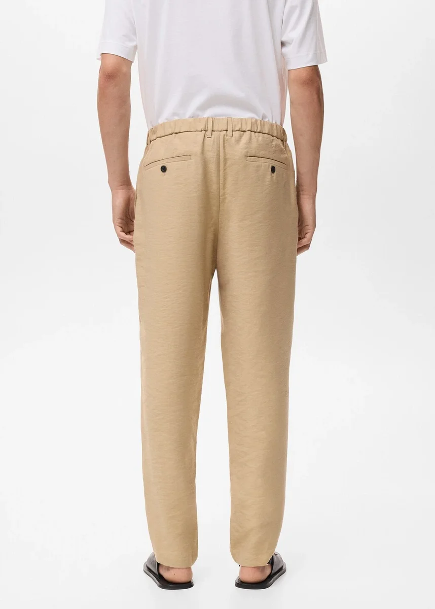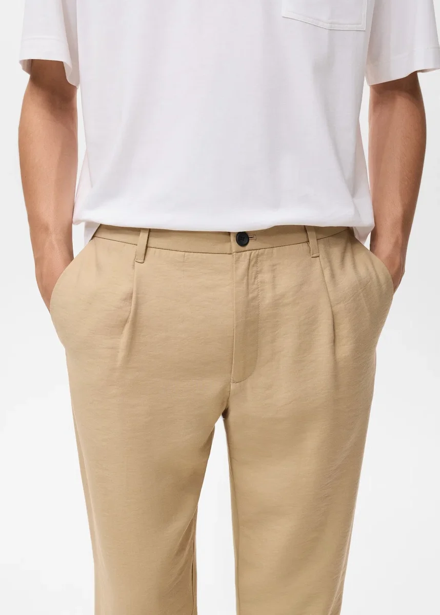 Rovný střih. Přední plisování. Poutka na pásek. Zapínání na zip a knoflík vpředu. Dvě přední kapsy. Dvě zadní kapsy s knoflíkem.