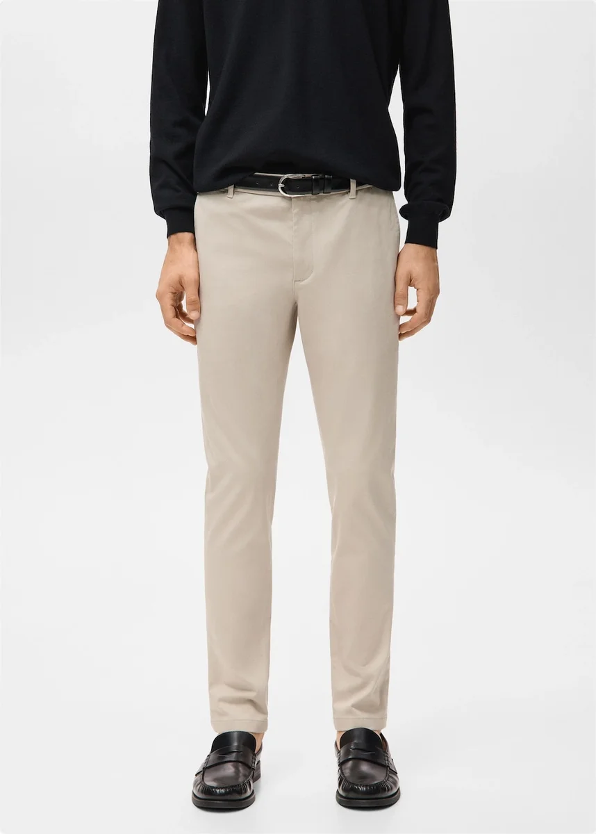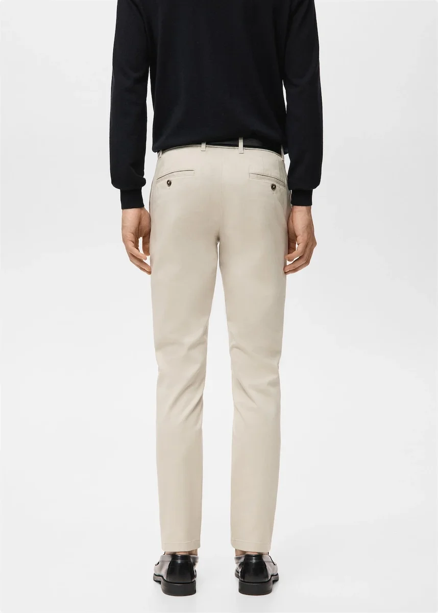 Úzký střih. Styl chino. Bavlněný elastický materiál. Poutka na opasek. Dvě boční kapsy. Kapsa na mince. Dvě zadní kapsy s lemováním. Zapínání na zip a knoflík