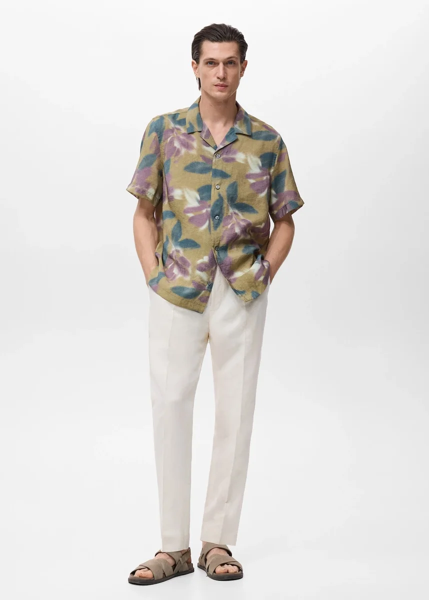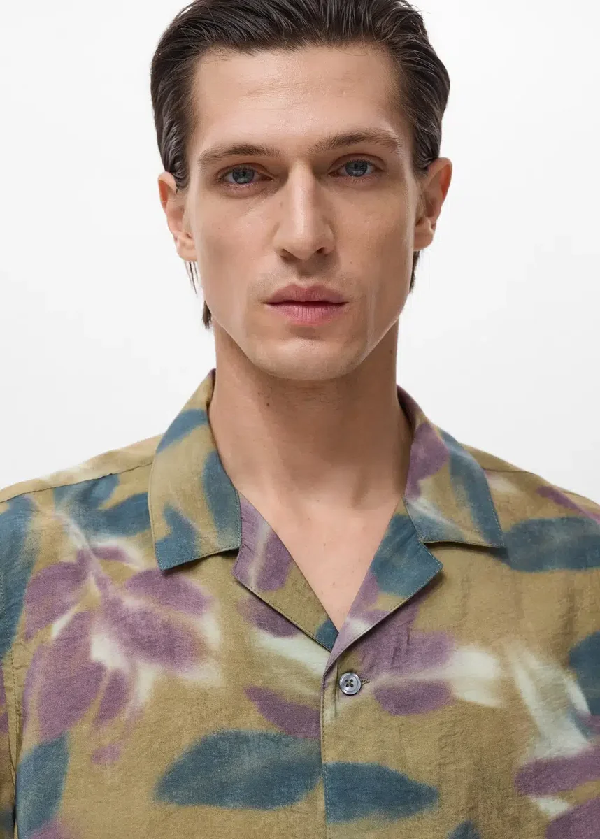 Modální tkanina. Regular fit. Květinový potisk. Bowlingový límec. Krátký rukáv. Zapínání na knoflíky vpředu.