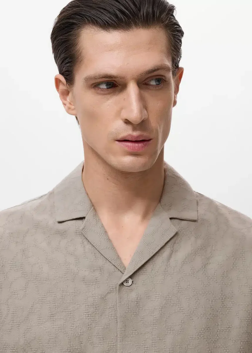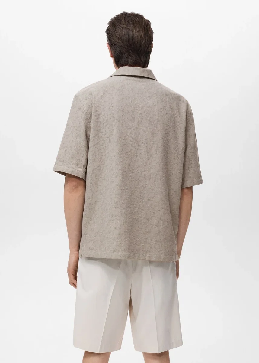 100 % bavlna. Regular střih. Vyšívaná strukturovaná tkanina. Bowlingový límec. Krátké rukávy. Zapínání na knoflíky vpředu. Modelka je vysoká 170 cm a má na sobě velikost M.