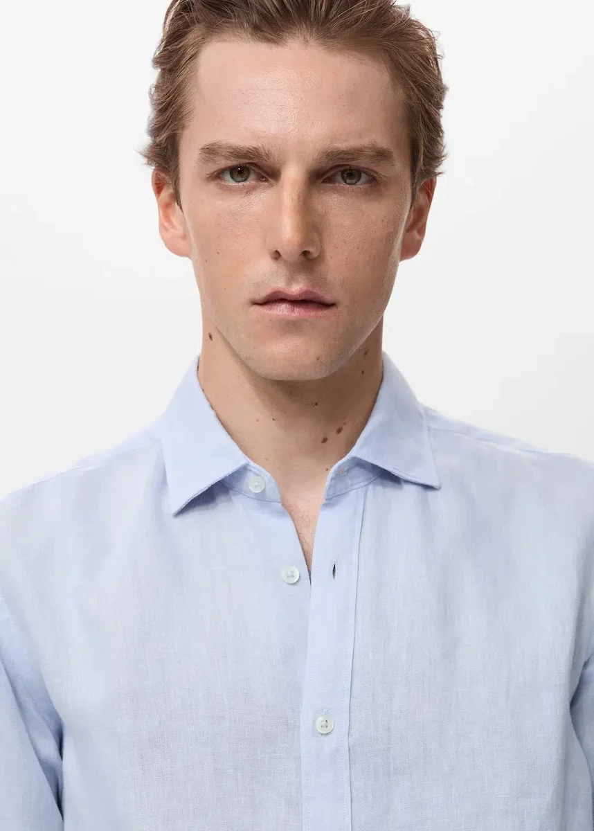 Regular fit. 100% lněná tkanina. Košilový límec. Zapínání na knoflíky vpředu. Dlouhé rukávy s manžetami na knoflíky. Zadní detail se záševky. Zaoblený lem. Světle modrá barva je exkluzivně k dostání online. Porcelánově modrý model je exkluzivně k dostání online.