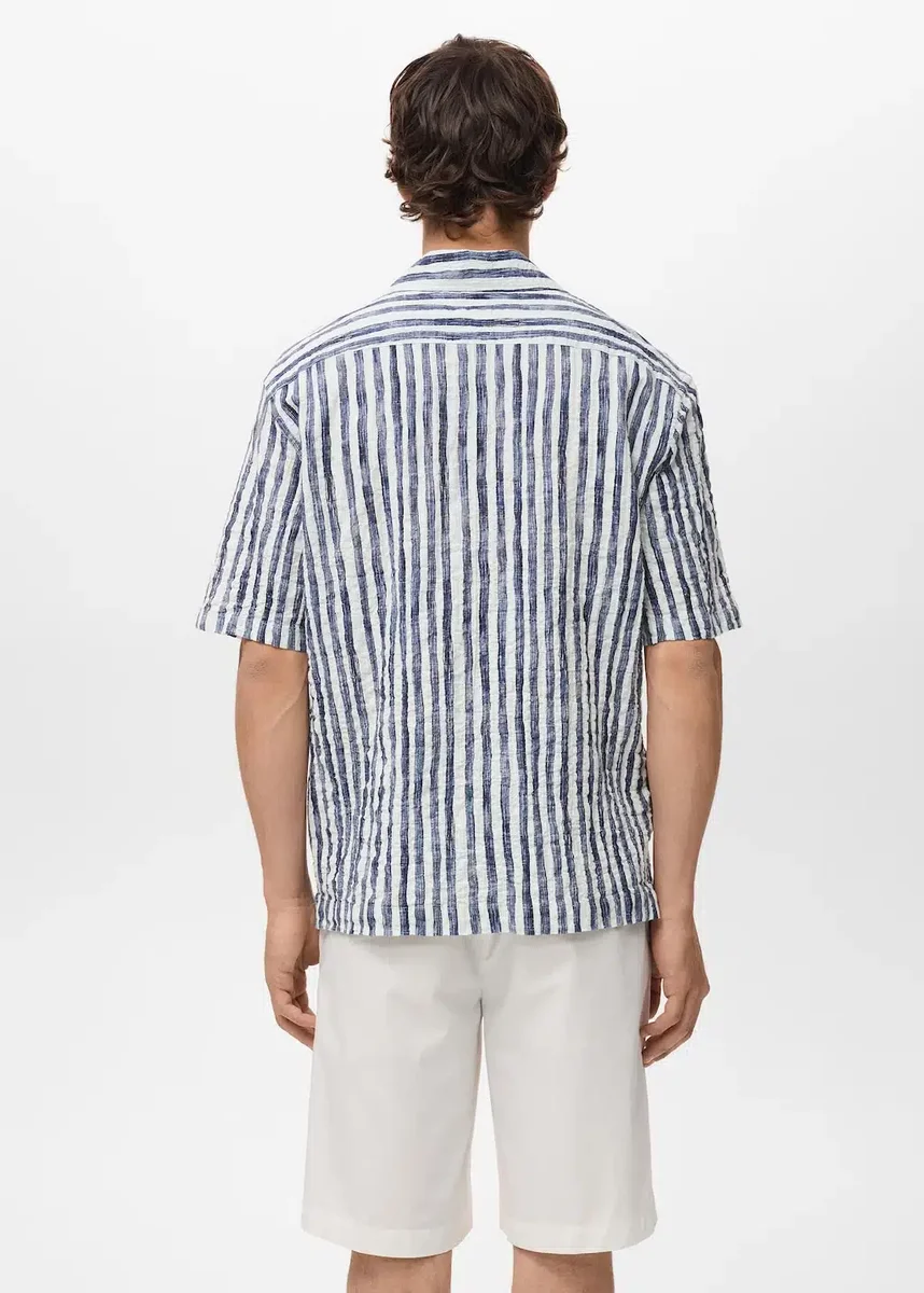 Bavlněná tkanina. Pruhovaný potisk. Košilový límec. Krátké rukávy. Volný střih. Zapínání na knoflíky. Složení: 98 % bavlna, 2 % elastan. Praní v pračce max. 40 °C / 105 °F, krátké odstřeďování. Nebělit. Žehlení max. 110 °C / 230 °F. Chemické čištění perchloroethylenem. Nesušit v sušičce. Bavlněná tkanina. Pruhovaný potisk. Košilový límec. Krátký rukáv. Volný střih. Zapínání na knoflíky.