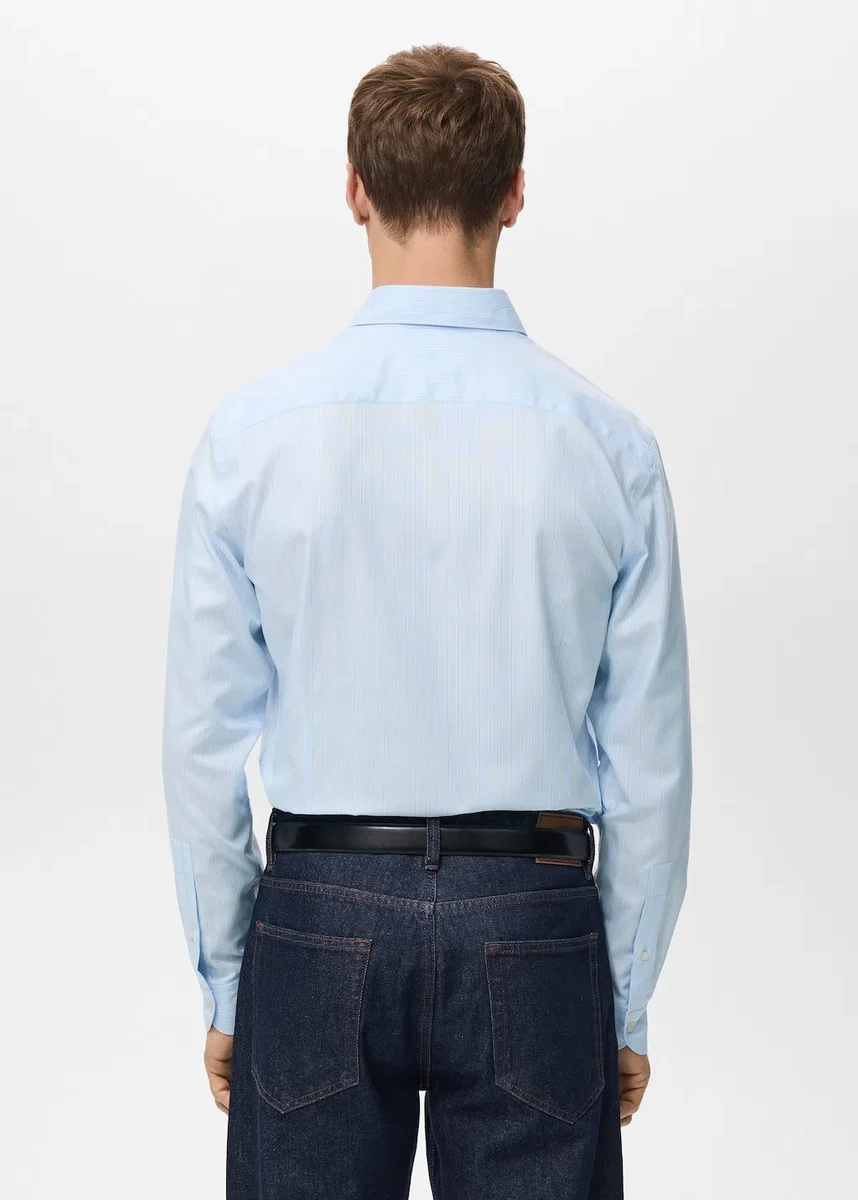 Slim fit. 100% bavlna. Jemné pruhy. Košilový límec. Dlouhé rukávy s manžetami na knoflíky. Zapínání na knoflíky vpředu