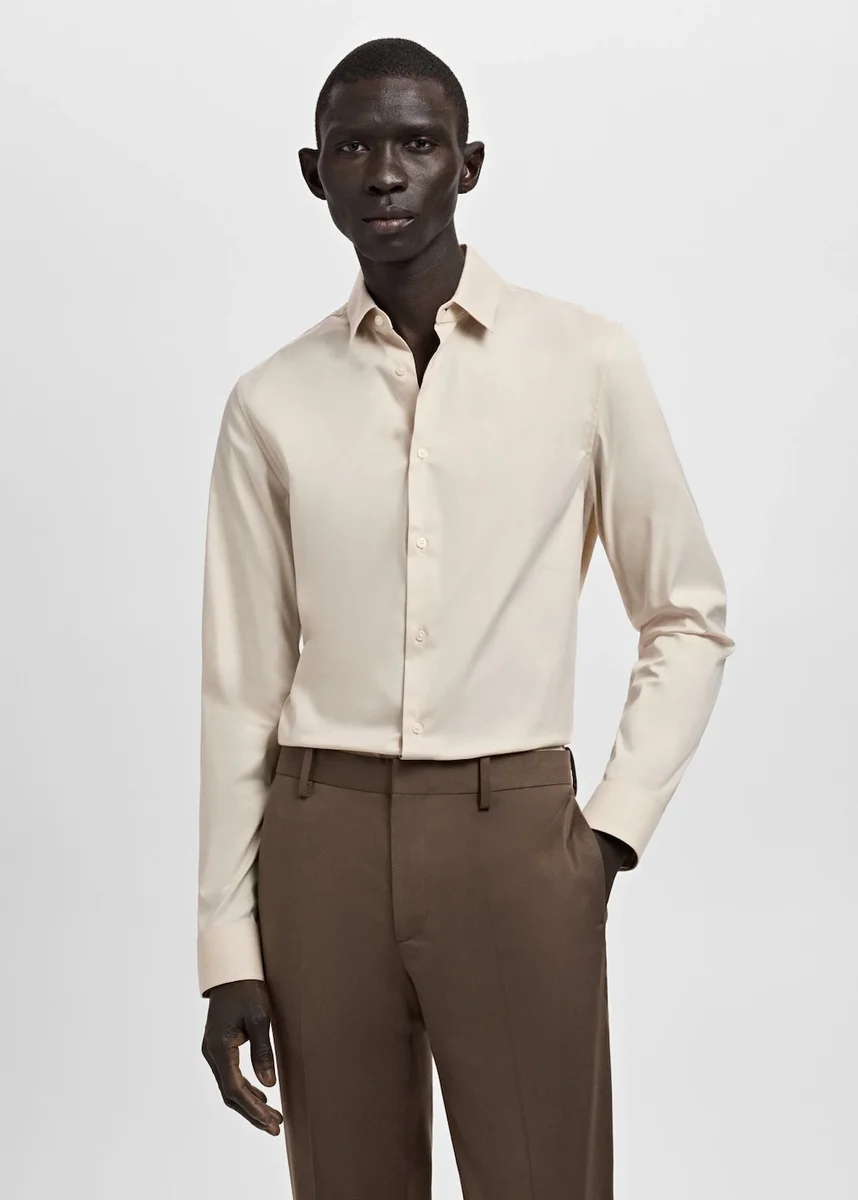 Košilový límec s klopami. Slim fit. Pružný bavlněný materiál. Klasický límeček. Zapínání na knoflíky vpředu. Dlouhé rukávy s manžetami na knoflíky. Zaoblený spodní lem. Standardní délka. Dlouhé rukávy. Lehká plochá struktura. Zapínání vpředu. Silueta Super Slim Fit