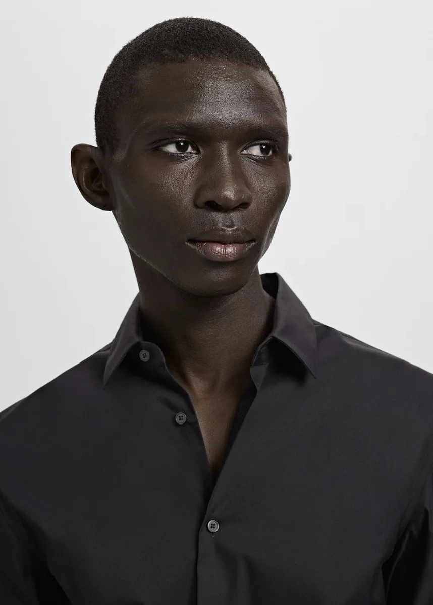 Košilový límec s klopami. Slim fit. Pružný bavlněný materiál. Klasický límeček. Zapínání na knoflíky vpředu. Dlouhé rukávy s manžetami na knoflíky. Zaoblený spodní lem. Standardní délka. Dlouhé rukávy. Lehká plochá struktura. Zapínání vpředu. Silueta Super Slim Fit