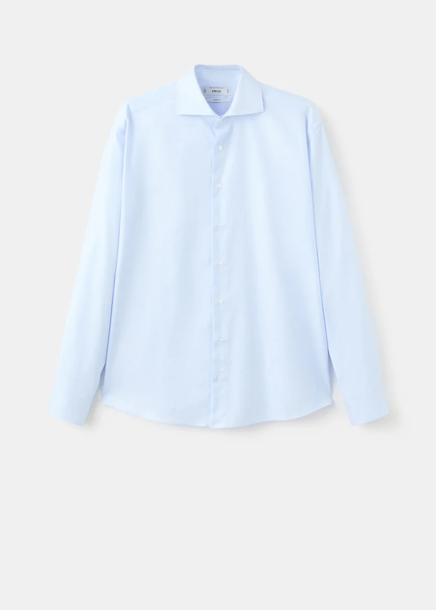 Úzký střih. 100% bavlna. Bavlněná keprová struktura. Mikro vzor pepř a sůl. Rozložený límec. Zapínání na knoflíky vpředu. Dlouhé rukávy s manžetami na knoflíky. Zaoblený lem.