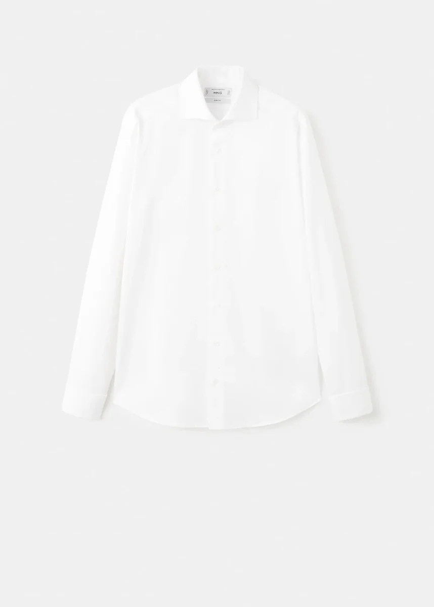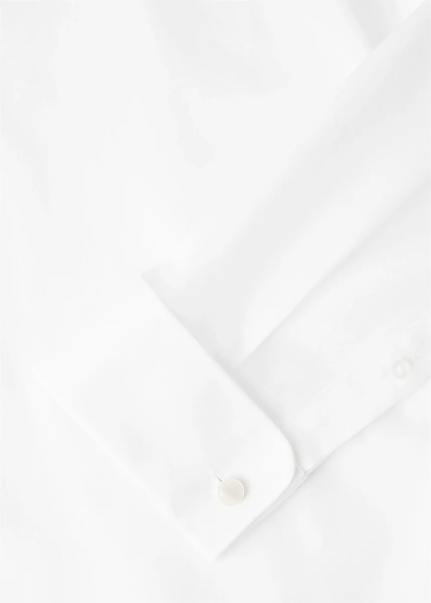 Úzký střih. Bavlněný kepr. Rozparkový límec. Dvojité manžety s manžetovými knoflíčky. Dlouhé rukávy s knoflíky. Zapínání na knoflíky vpředu. Zaoblený lem.