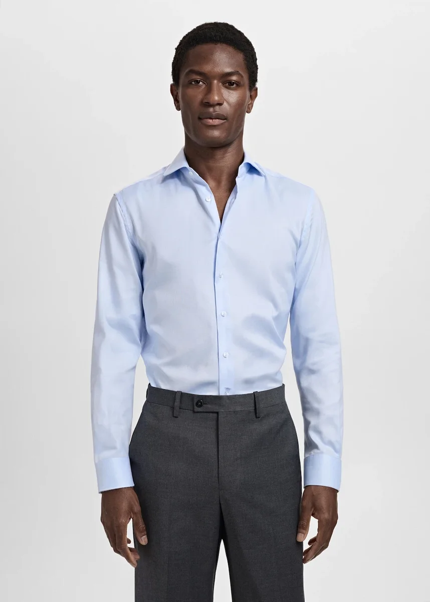 Standardní délka. Dlouhé rukávy. Lehká plochá struktura. Slim silueta. Zapínání vpředu. Klopový límec. Slim fit. 100% bavlna. Klasický límec. Tkanina s mikrostrukturou. Rozložený límec. Zapínání na knoflíky vpředu. Manžety na knoflíky. Zaoblený lem. Dlouhé rukávy s manžetami na knoflíky.