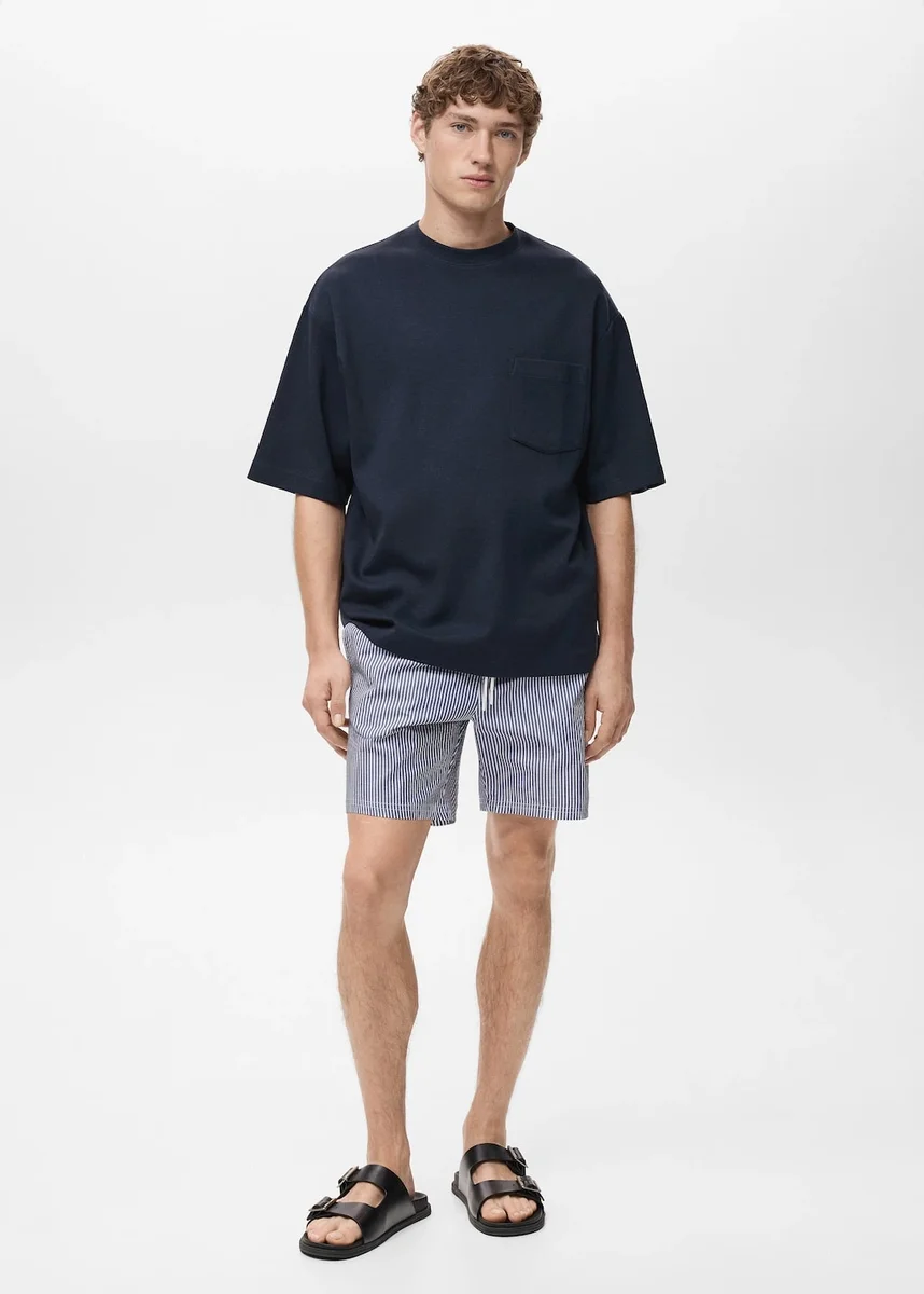 Boxerový střih. Bavlněná směsová tkanina. Seersuckerový efekt. Elastický pas s nastavitelnou šňůrkou. Dvě boční kapsy. Nášivková kapsa na zadní straně s suchým zipem. Malé boční rozparky na lemu. Seersuckerová tkanina