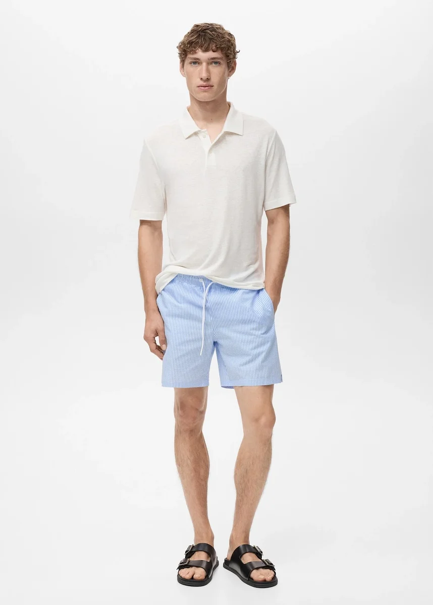 Boxerový střih. Směs bavlny. Seersuckerový efekt. Elastický pas s nastavitelnou šňůrkou. Dvě boční kapsy. Zadní našitá kapsa se suchým zipem. Malé boční rozparky na lemu. Seersuckerová tkanina