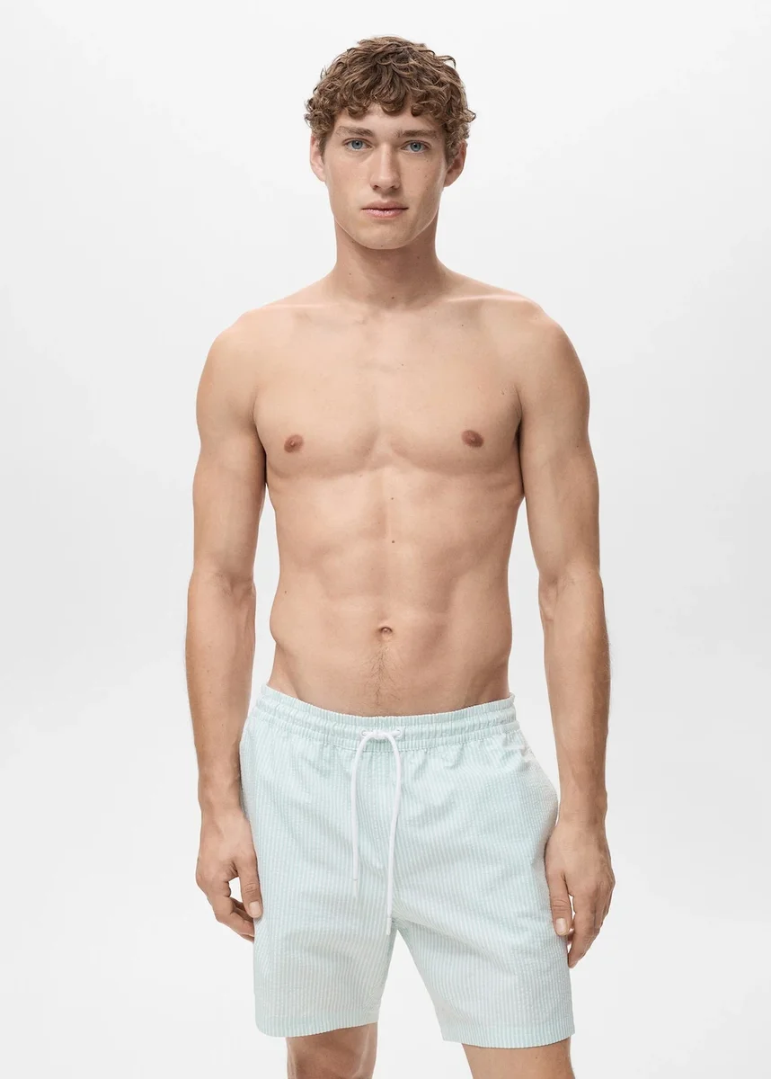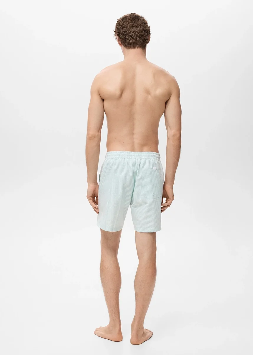 Boxerový střih. Směs bavlny. Seersuckerový efekt. Elastický pas s nastavitelnou šňůrkou. Dvě boční kapsy. Zadní našitá kapsa se suchým zipem. Malé boční rozparky na lemu.