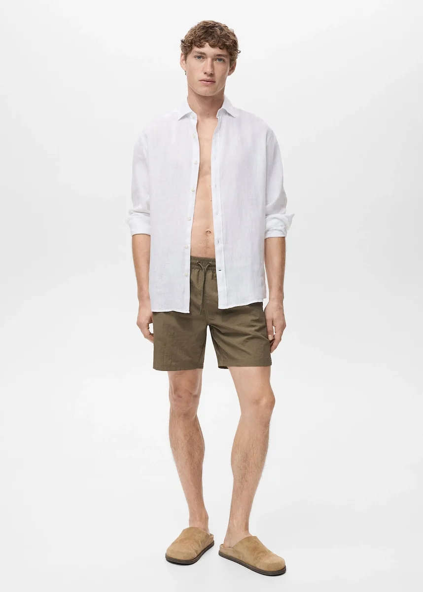 Boxerový střih. Elastický pas s nastavitelnou šňůrkou. Dvě boční kapsy. Nášivková kapsa na zadní straně s suchým zipem. Malé boční rozparky na lemu. Propagační produkt