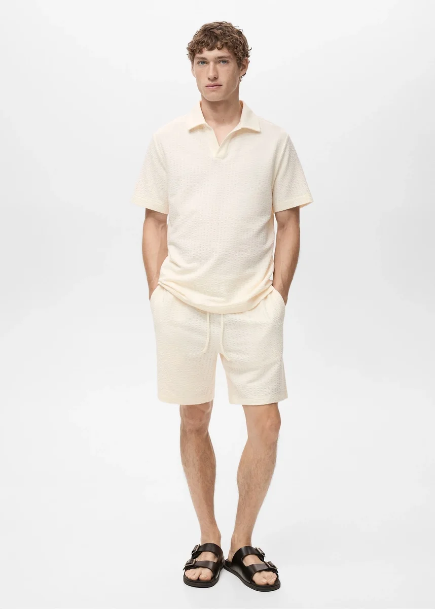 Směs bavlny. Rovný střih. Seersuckerový efekt. Polo tričko s límečkem bez knoflíků. Krátký rukáv. Rovný lem. Sada k dispozici jako kompletní look